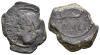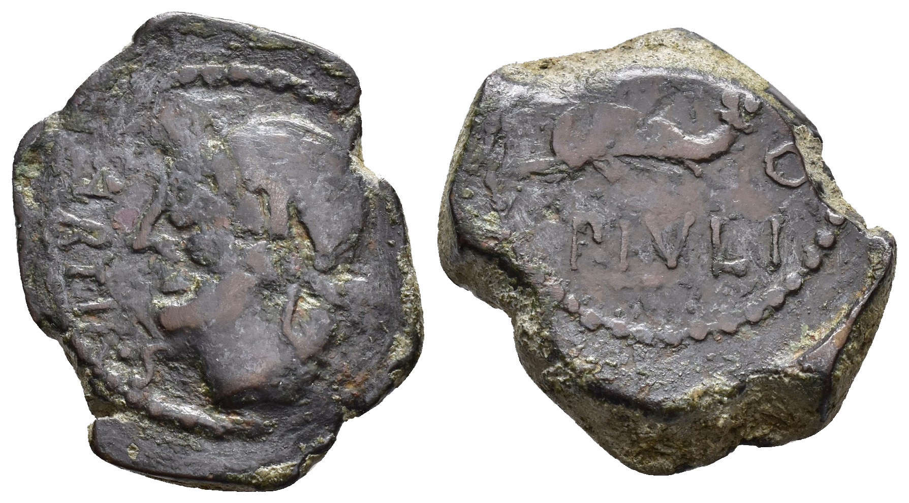 HISPANIA ANTIGUA. CARTEIA. Semis. A/ Cabeza de Saturno a izq., delante CARTIA.S. R/ Delfín a izq., Q detrás de la cola del delfín. AE 11,33 g. 25,2 mm. I-648 vte.; ACIP-2552. CC-3502, mismo ejemplar. Cospel irregular. Pátina oscura con tonos rojos. MBC-- Muy escasa.