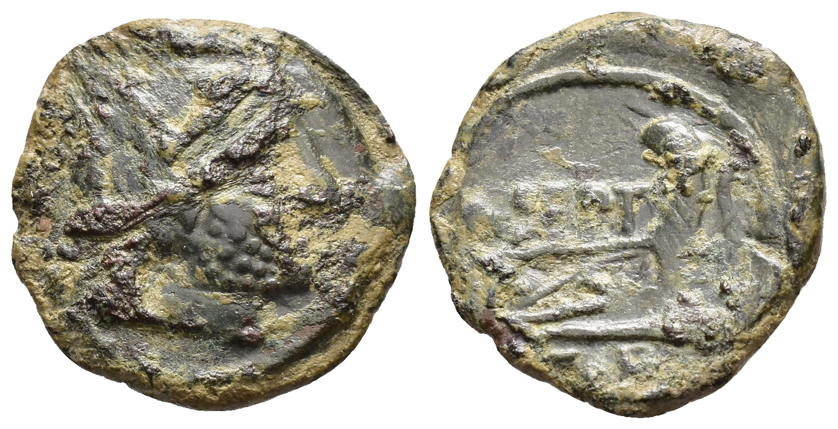 HISPANIA ANTIGUA. CARTEIA. Semis. A/ Cabeza de Saturno a der. R/ Delfín a der., y ley. M. SEPT. AE 5,77 g. 22,1 mm. ACIP-2568; CC-3522, mismo ejemplar. Pátina verde con concreciones. MBC-/MBC. Rarísima.