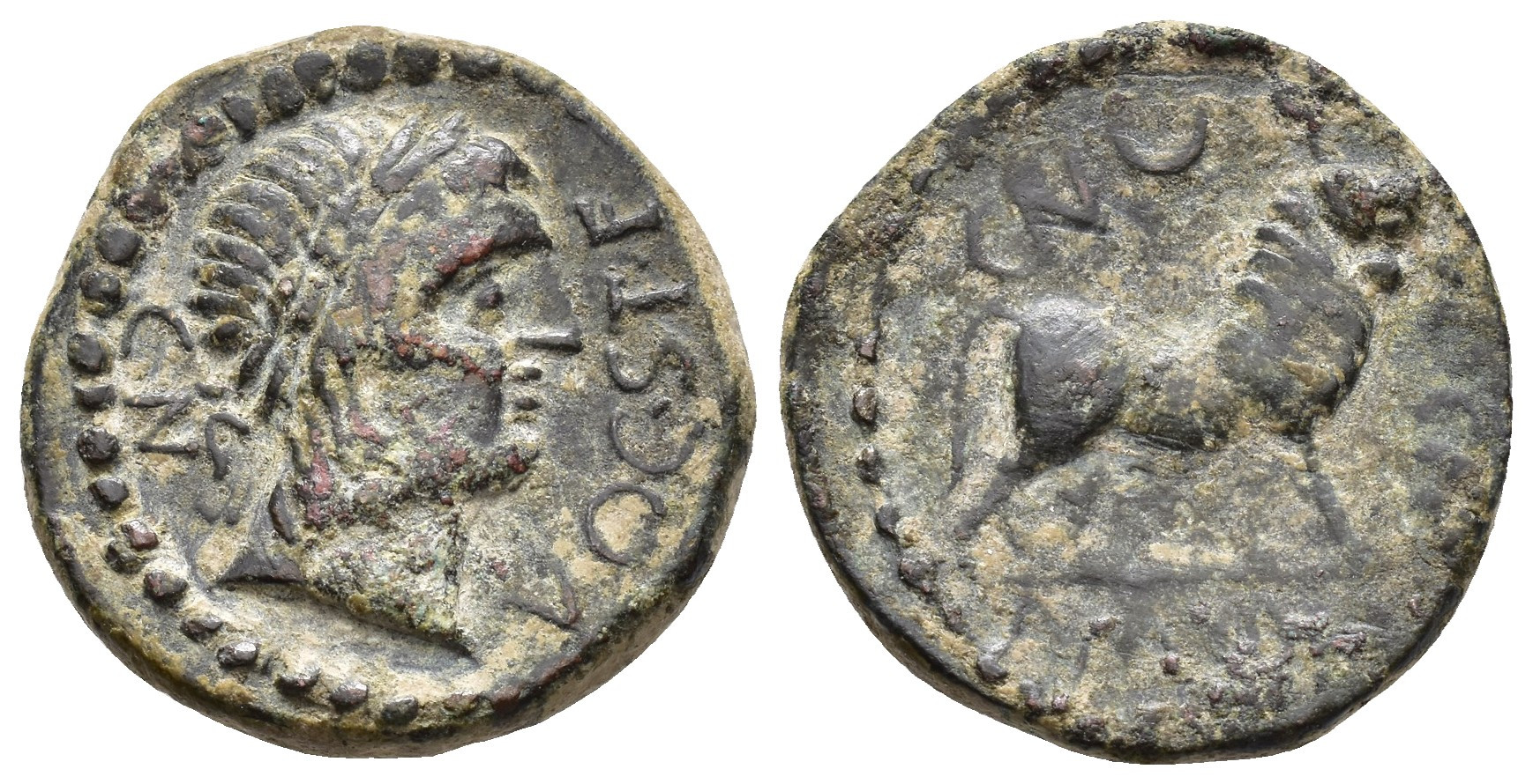 HISPANIA ANTIGUA. KASTILO-CASTULO. Semis. A/ Cabeza de Apolo laureada a der.; CN VOC STF. R/ Toro a der.; CN (FVL CNF), debajo KaSTiLO, poco legible. AE 9,2 g. 23,3 mm. I-728; ACIP-2119. Concreciones. Pátina verde. MBC/MBC-.