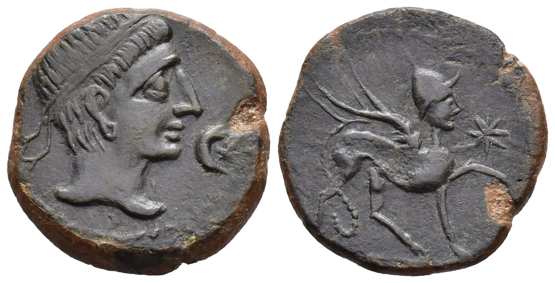 HISPANIA ANTIGUA. KASTILO-CASTULO. As. A/ Cabeza masculina laureada y con ínfulas a der. R/ Esfinge a der., delante, estrella, debajo KaSTIiLO, no visible. AE 9,6 g. 24,9 mm; I-702; ACIP-2137. Pátina verde oscuro. MBC+/MBC.