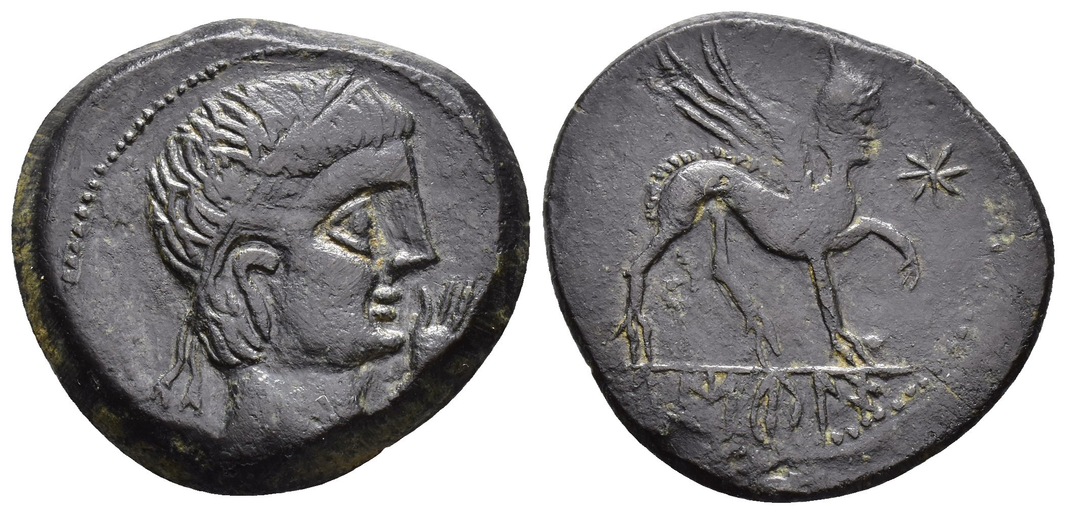 HISPANIA ANTIGUA. KASTILO-CASTULO. Unidad. A/ Cabeza masculina diademada a der., delante mano. R/ Esfinge avanzando a der., delante estrella, en exergo KaSTiLO. AE 11,4 g. 26,7 mm. I-701; ACIP-2143. Pátina verde oscuro. MBC+/MBC.