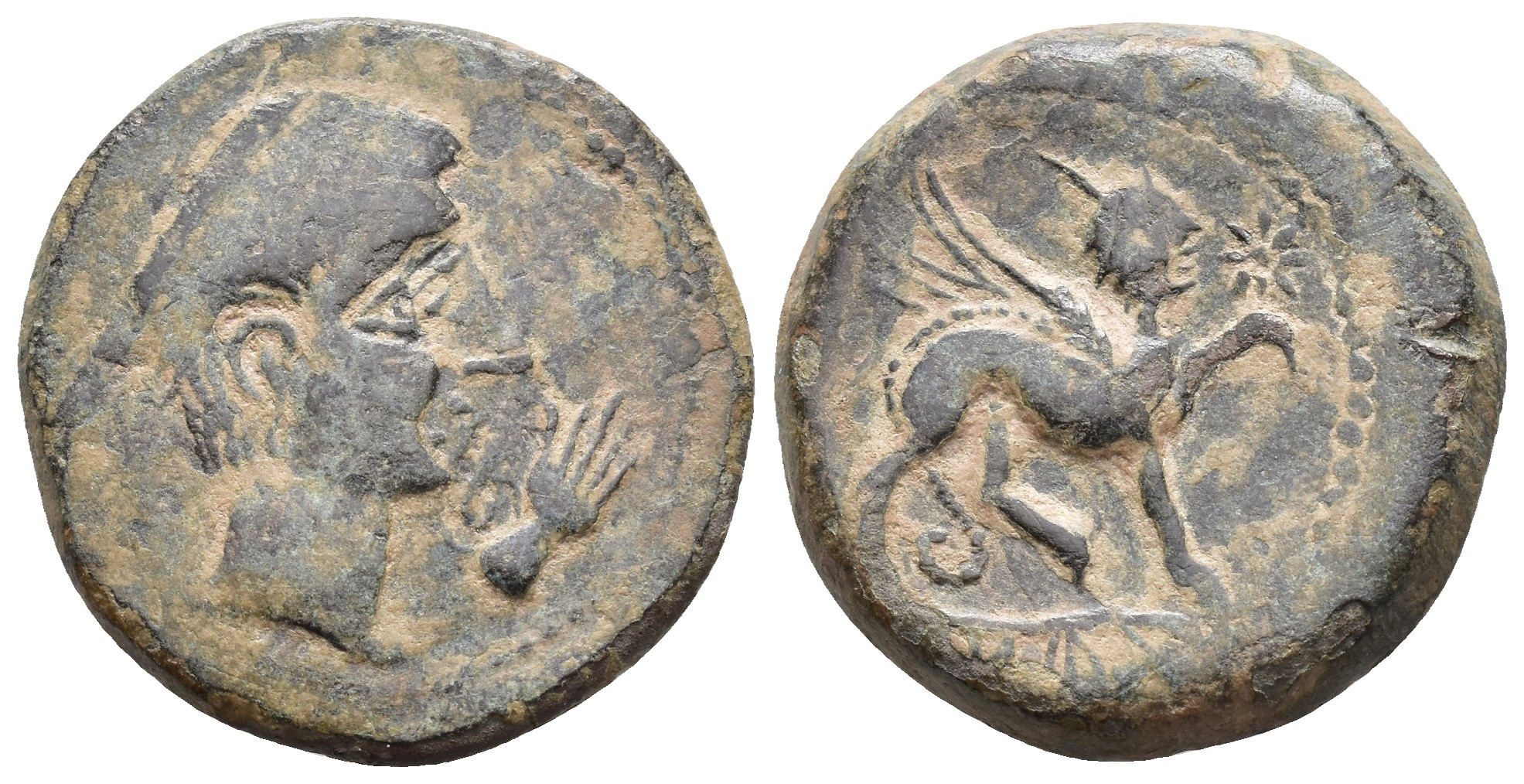 HISPANIA ANTIGUA. KASTILO-CASTULO. Unidad. A/ Cabeza masculina diademada a der., delante mano. R/ Esfinge avanzando a der., delante estrella, en exergo KaSTiLO. AE 15,03 g. 27 mm. I-701; ACIP-2143. Pátina verde. MBC-.