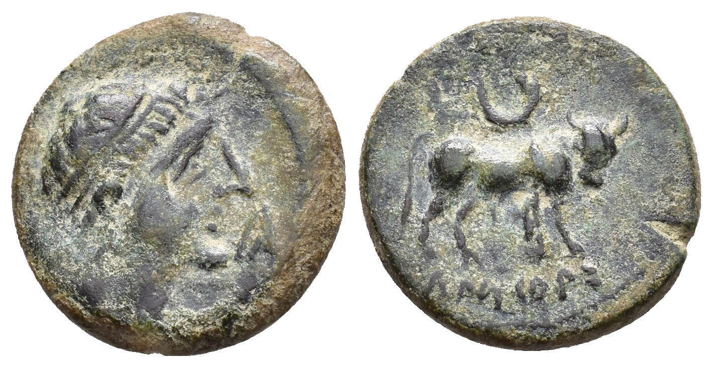 HISPANIA ANTIGUA. KASTILO-CASTULO. Semis. A/ Cabeza diademada a der., delante Ka. R/ Toro a der., encima creciente y L, debajo KaSTiLO. AE 4,50 g. 18,8 mm. I-725; ACIP-2156 vte. CC-2674, mismo ejemplar. Pátina verde. MBC. Escasa.