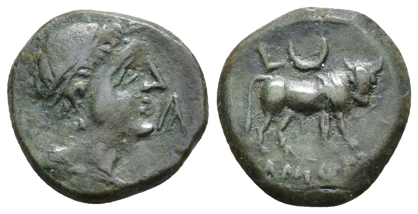 HISPANIA ANTIGUA. KASTILO-CASTULO. Semis. A/ Cabeza diademada a der., delante Ka. R/ Toro a der., encima creciente y L, exergo KaSTiLO. AE 4,4 g. 17,2 mm. I-722; ACIP-2156 vte. signo Ka recto. Pátina verde. MBC/MBC+.