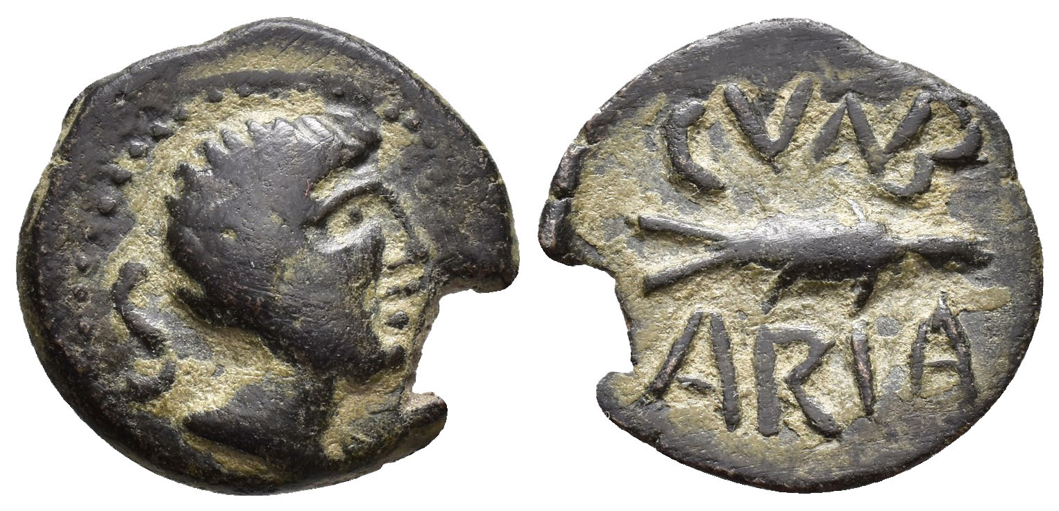 HISPANIA ANTIGUA. CUNBARIA. Semis. A/ Cabeza masculina a der., detrás S. R/ Atún a der., encima CVNB, debajo ARIA. AE 3,86 g. 19,2 mm. I-878; ACIP-2620; CC-3203, mismo ejemplar. Pátina oscura. MBC. Muy escasa.