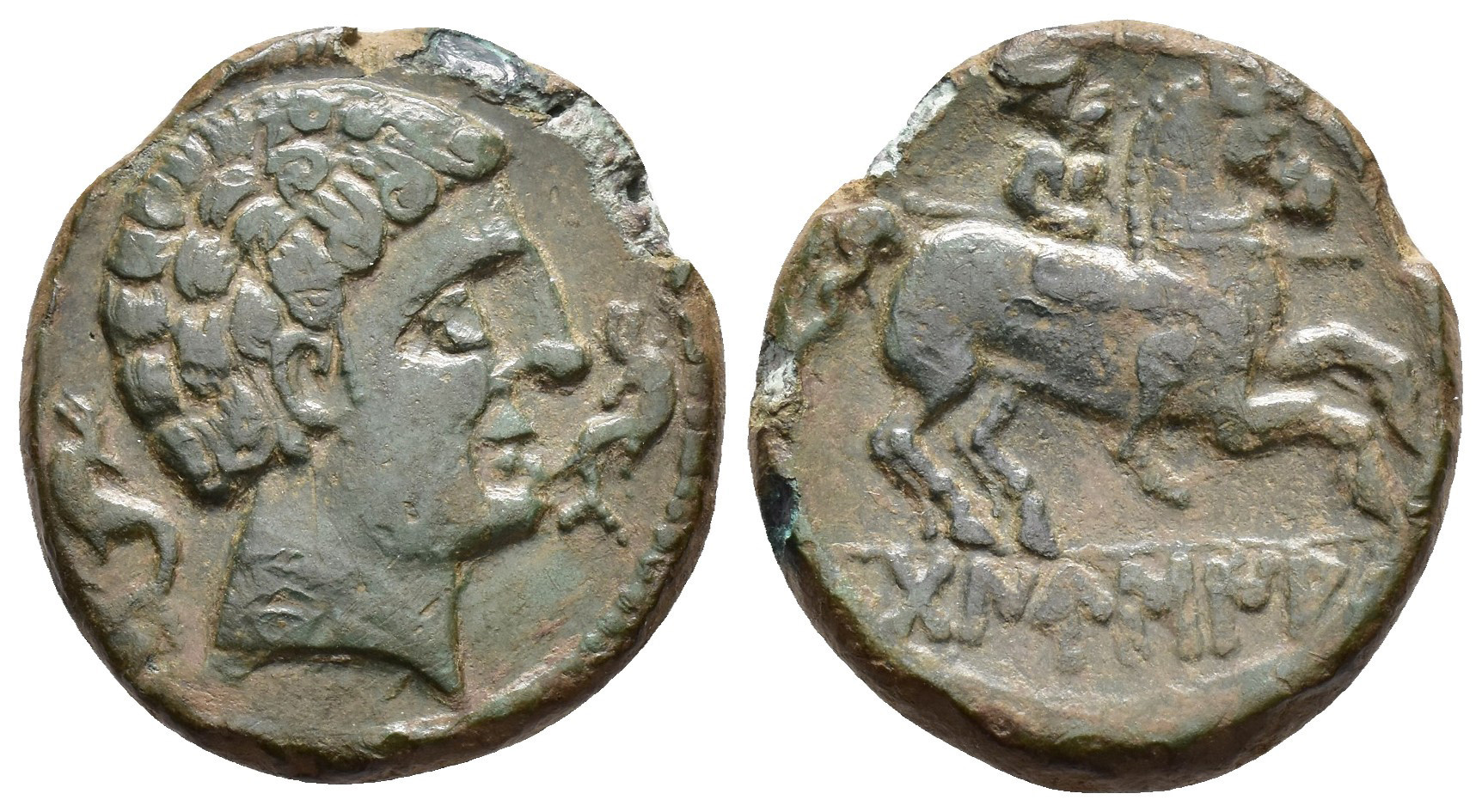 HISPANIA ANTIGUA. TAMUSIA. Unidad. A/ Cabeza masculina con collar a der. entre dos delfines. R/ Jinete lancero a der., en exergo TaMUSIA. AE 7,36 g. 24,7 mm. I-894; ACIP-1618. Pátina verde con erosiones en el canto. MBC.
