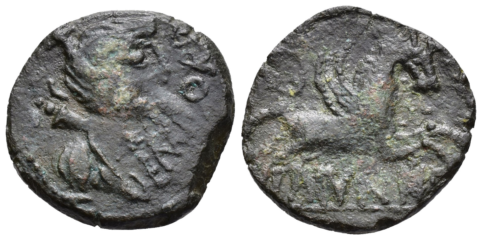 HISPANIA ANTIGUA. EMPORION. As. A/ Busto de Diana a der., delante EMPOR(IA). R/ Pegaso volando a der., debajo sobre línea MVNICI, poco visible. AE 9,01 g. 24,3 mm. I-1242. ACIP-1061. Pátina verde oscuro. BC+/BC.