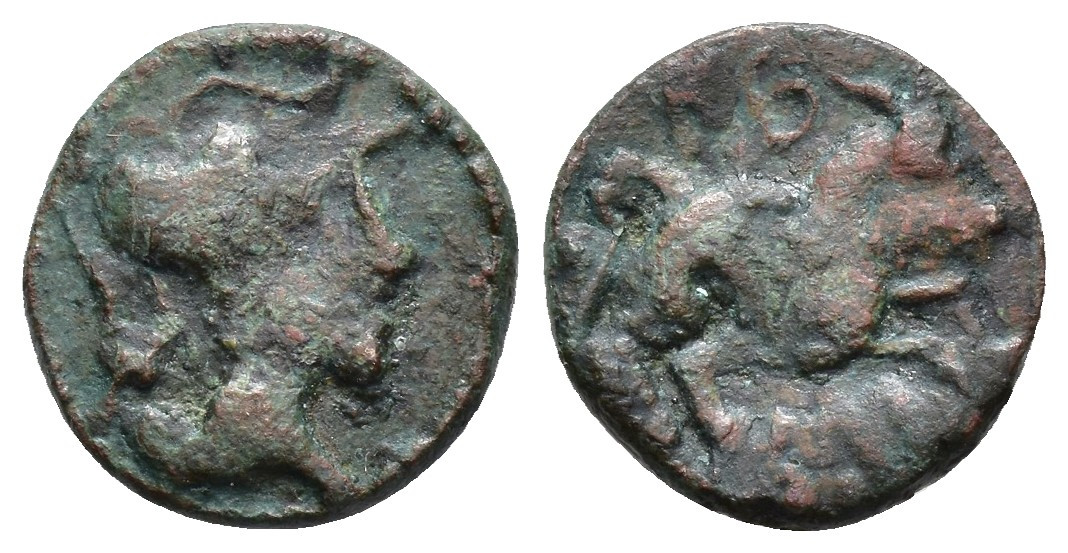 HISPANIA ANTIGUA. EMPORION. Sexto. A/ Cabeza de Minerva a der. R/ Pegaso volando a der., encima corona, debajo EM, poco visible. AE 1,8 g. 13,7 mm. I-1273; APRH-239; ACIP-1069. Pátina verde con tonos rojos. BC+. Rara.