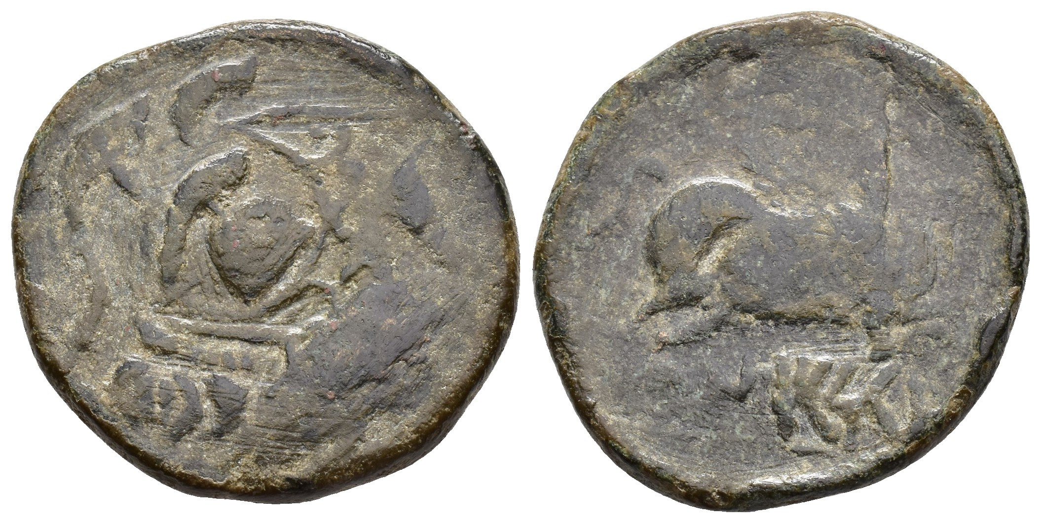 HISPANIA ANTIGUA. UNTIKESKEN. As. A/ Cabeza de Palas a der. R/ Pegaso volando a der. AE 14,4 g. 28,13 mm. Doble acuñación en anv. Pátina oscura. BC+/RC.