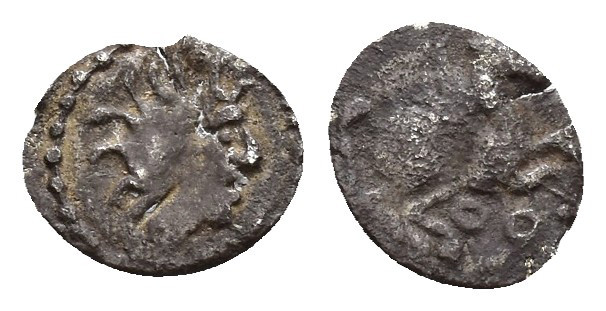 HISPANIA ANTIGUA. DIVISORES DE IMITACIÓN EMPORITANA. Tetartemorion. A/ Cabeza a der. R/ Pegaso a der., debajo dos glóbulos. AR 0,4 g. 6,9 mm. I-1197; ACIP-526. MBC-/BC+.