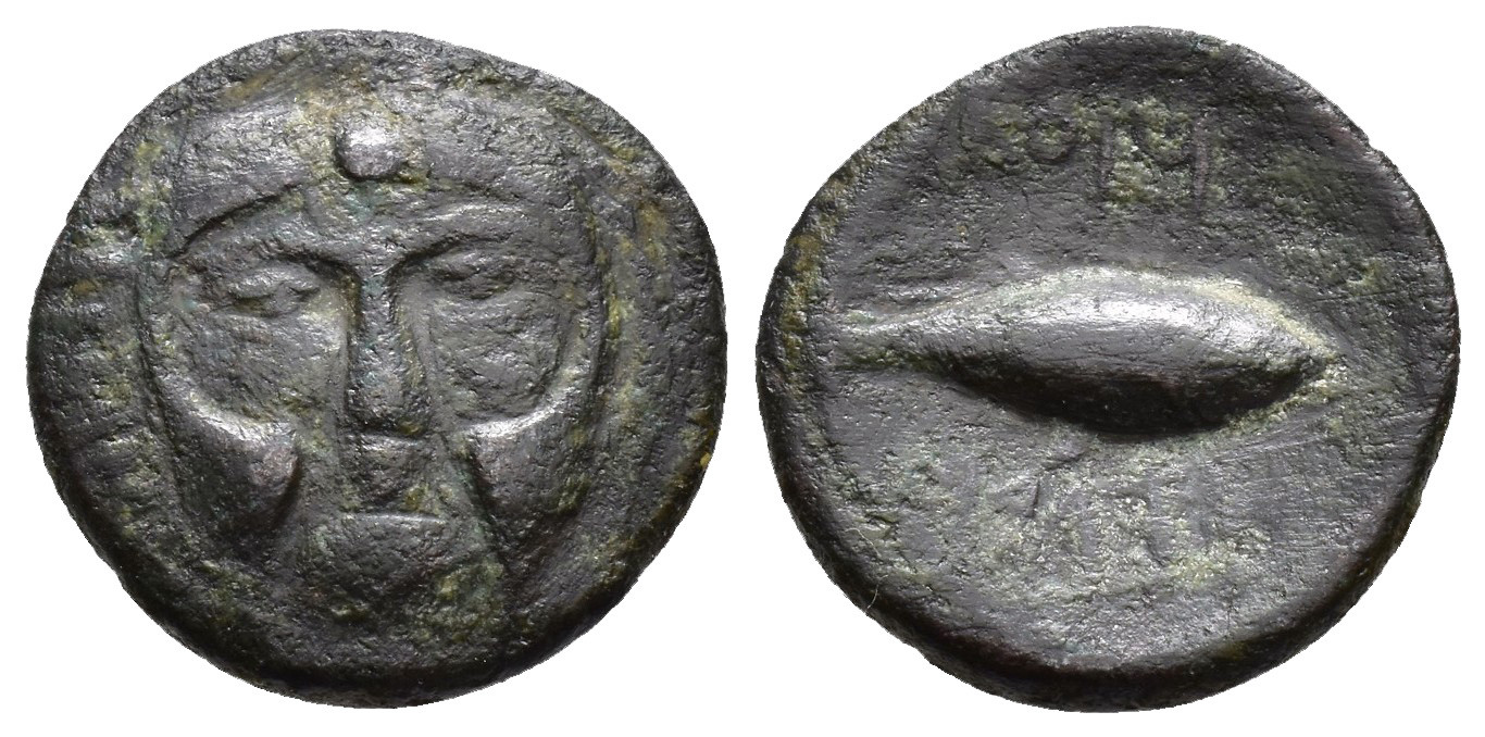 HISPANIA ANTIGUA. GADIR. Mitad. A/ Cabeza de frente de Melqart con leonté, R/ Atún a der., encima inscripción fenicia: MP'L, debajo: 'GDR. AE 3,3 g. 17,4 mm. I-1331; ACIP-652. Pátina oscura. MBC-. Muy escasa.