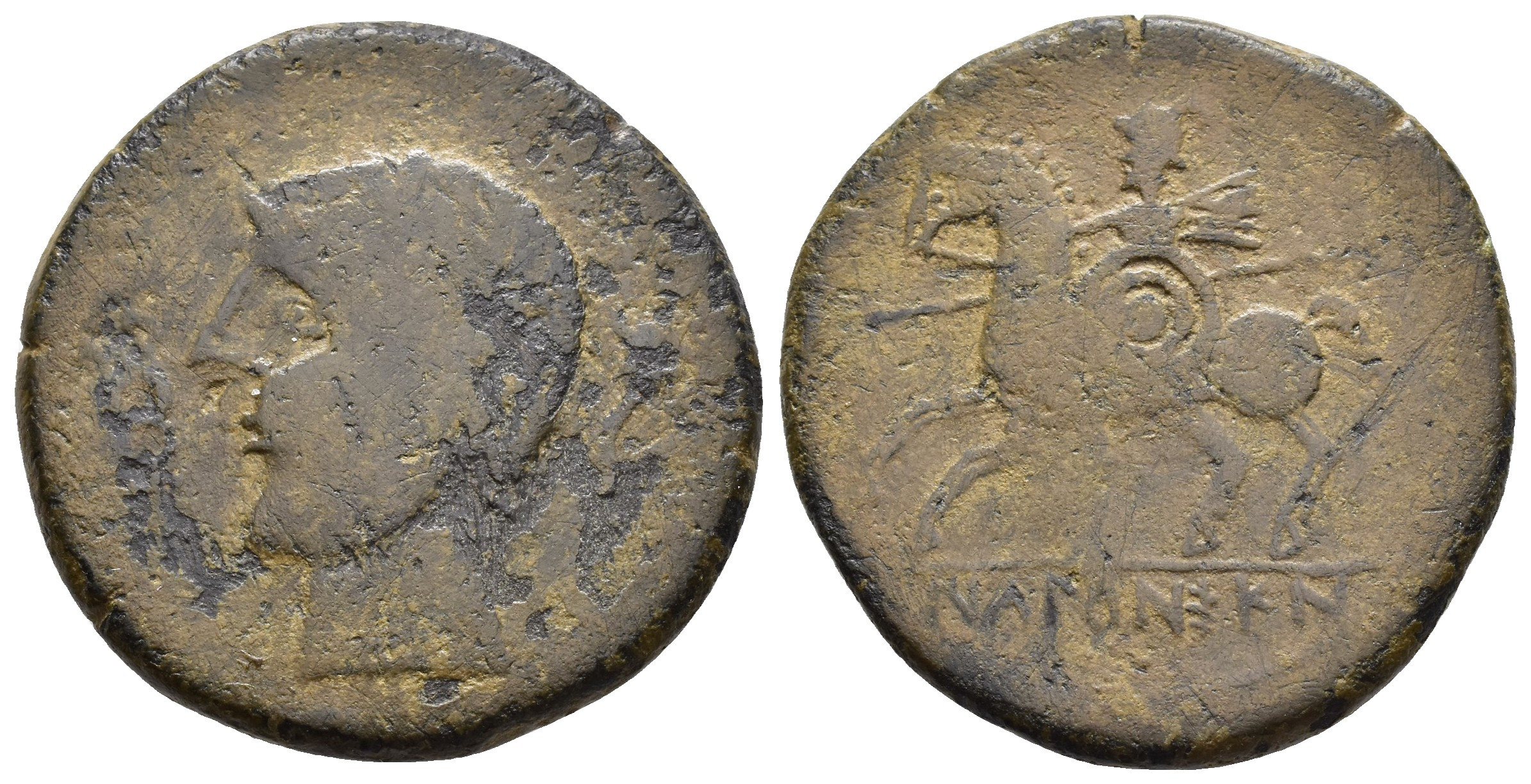 HISPANIA ANTIGUA. IKALESKEN. As. A/ Cabeza masculina con collar de puntos a izq., delante, caduceo, detrás delfín. R/ Jinete lancero a izq. con rodela, clámide y casco con penacho, en exergo IKaLENSKeN. AE 20 g. 32,7 mm. I-1416; ACIP-2087. Erosiones. BC. Rara.