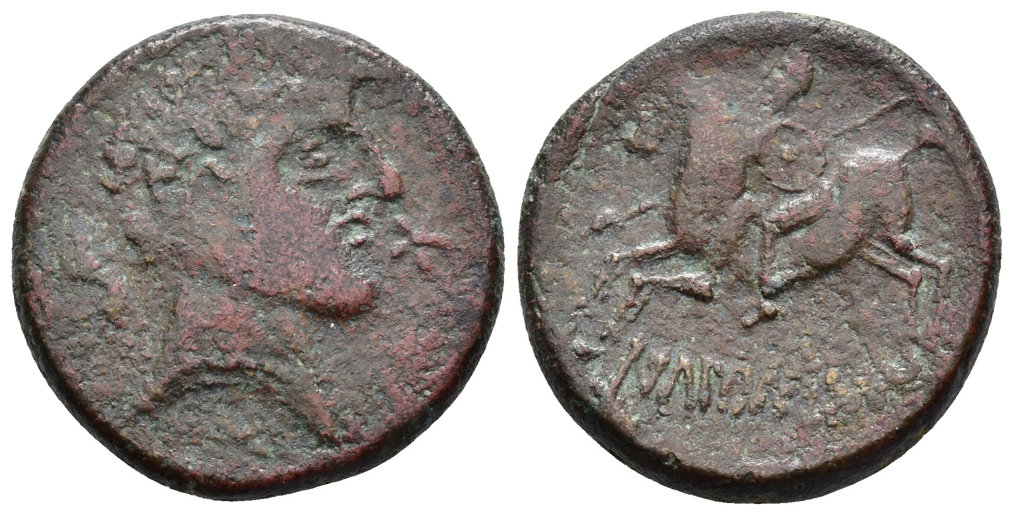 HISPANIA ANTIGUA. IKALESKEN. As. A/ Cabeza masculina con collar a der., delante estrella, detrás, delfín. R/ Jinete lancero con rodela a izq., debajo, ley. ibérica: IKALENSKEN. AE 14,64 g. 27,7 mm. I-1414; ACIP-2089. CC-2457, mismo ejemplar. Pátina rojiza rugosa. MBC-/BC+. Rara.