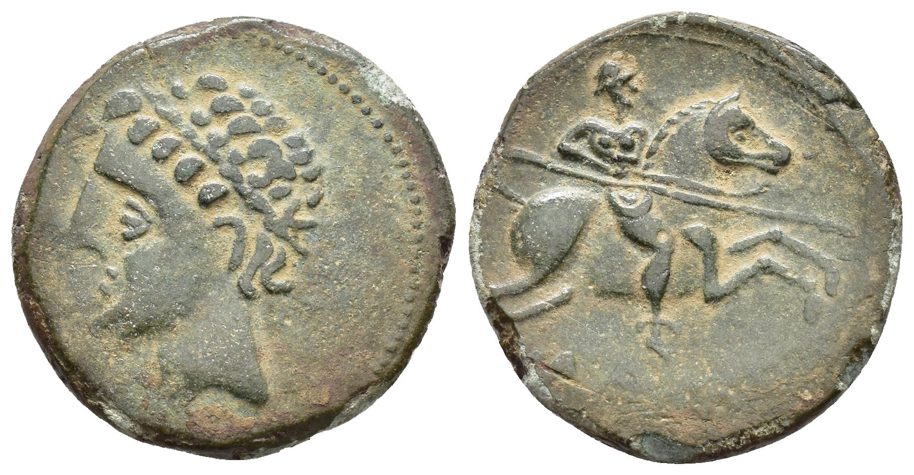 HISPANIA ANTIGUA. ILTURO. Unidad. A/ Cabeza masculina laureada a izq. R/ Jinete lancero a der., ley. no visible. AE 6,6 g. 24,7 mm. I-1442; ACIP-1346? Pátina verde. MBC.