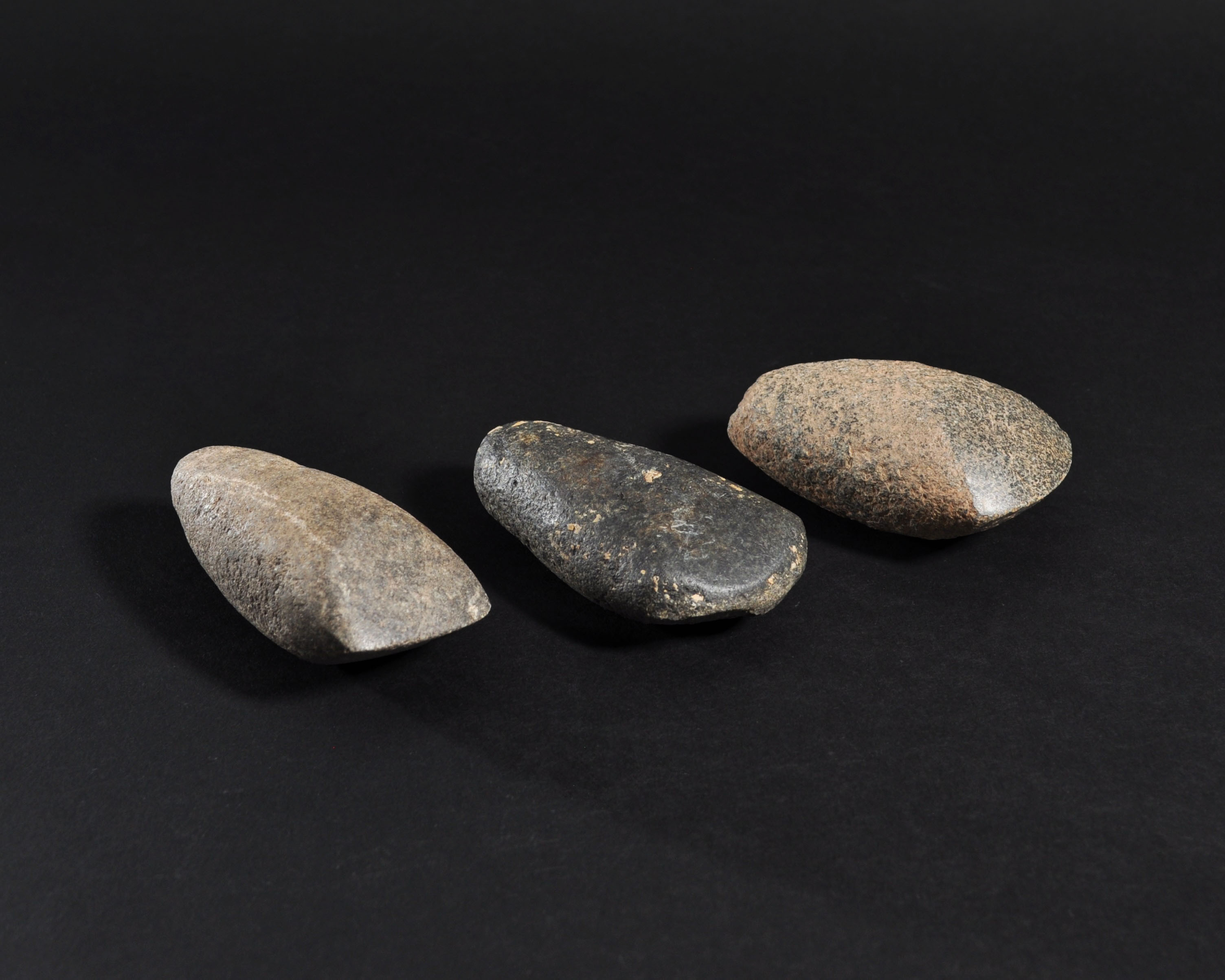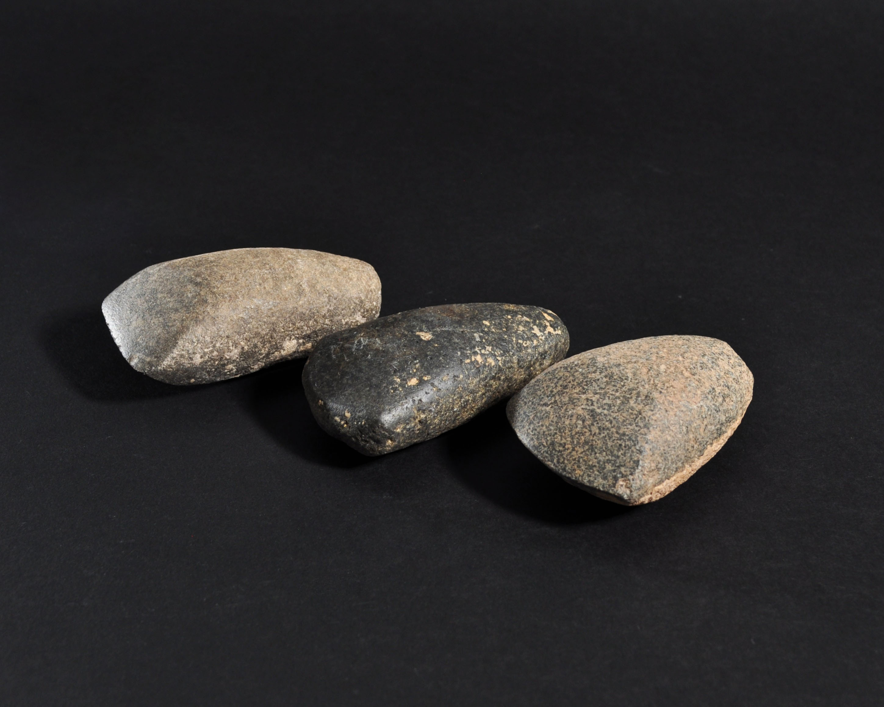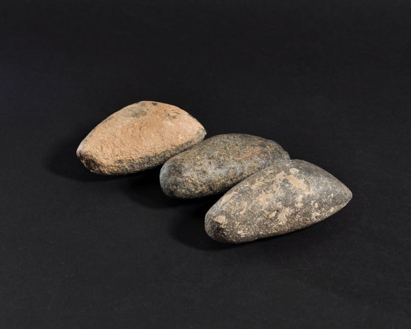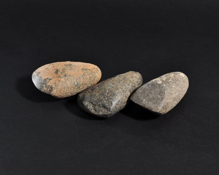 ARQUEOLOGÍA. PREHISTORIA. Neolítico. Lote de 3 hachas pulimentadas (5000-3000 a.C.). Piedra. Longitud de 8,5 a 9 cm.