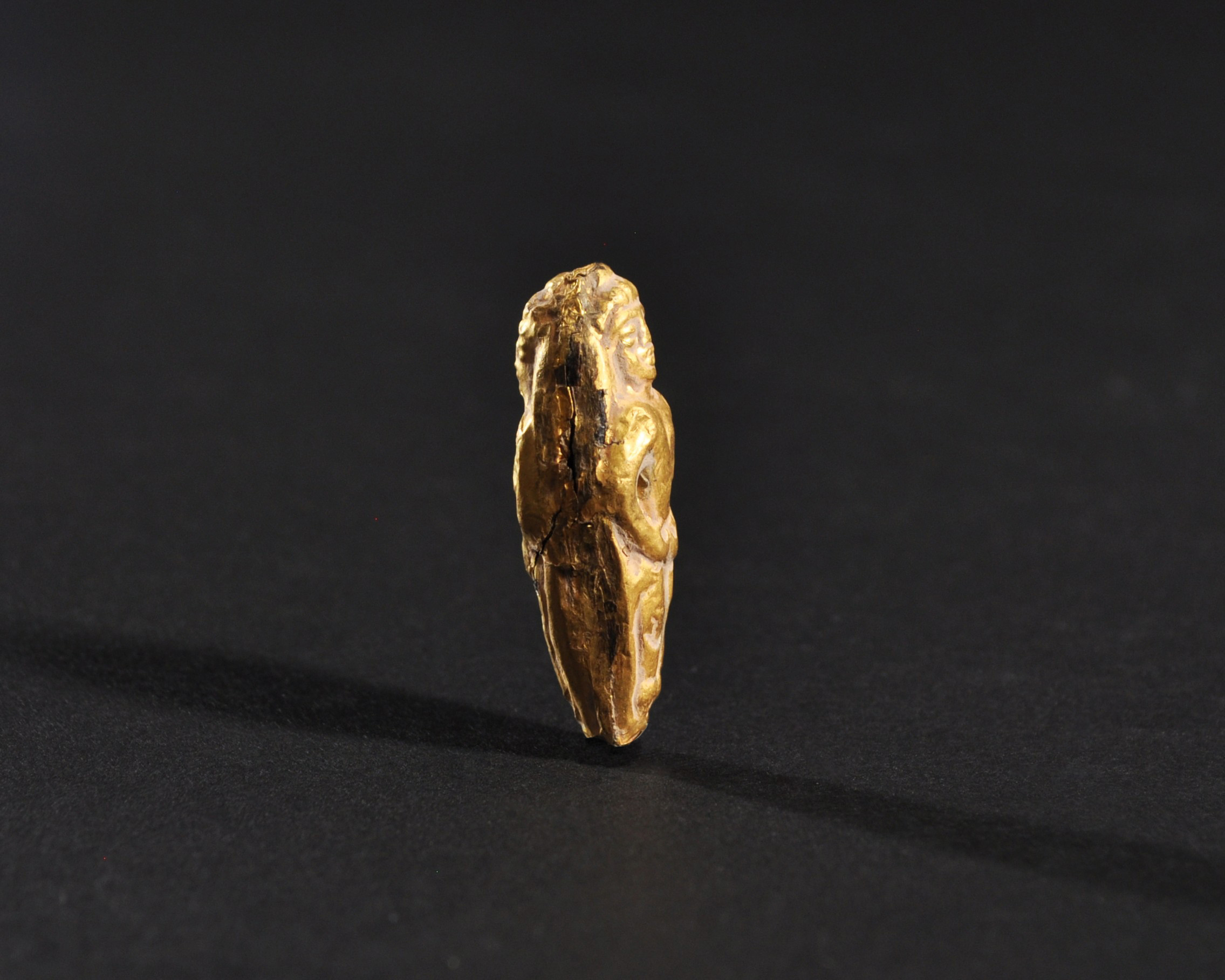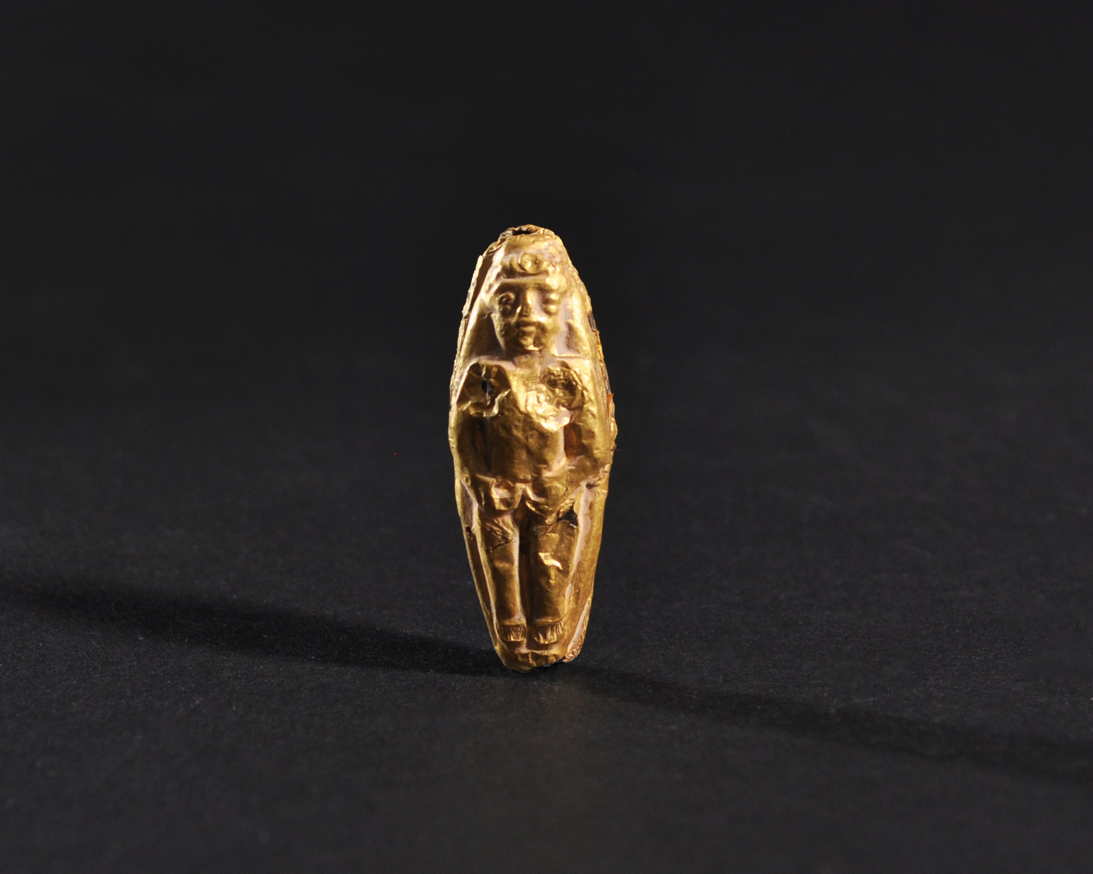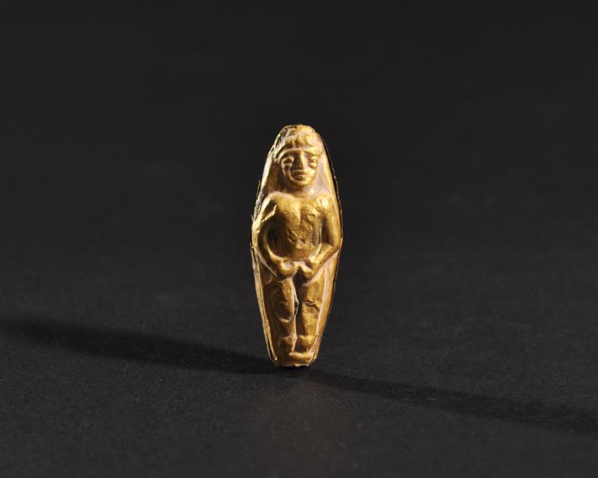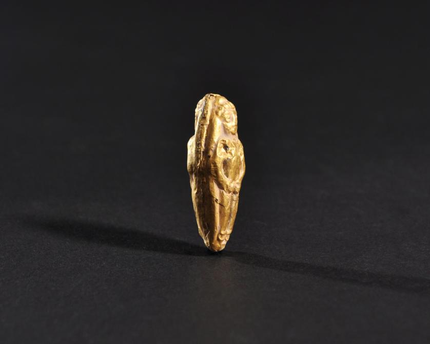 ARQUEOLOGÍA. GANDHARA. Cuenta en forma de Buda (ss. I a.C.- II d.C.). Material bituminoso cubierto de pan de oro. Altura 3,5 cm.
