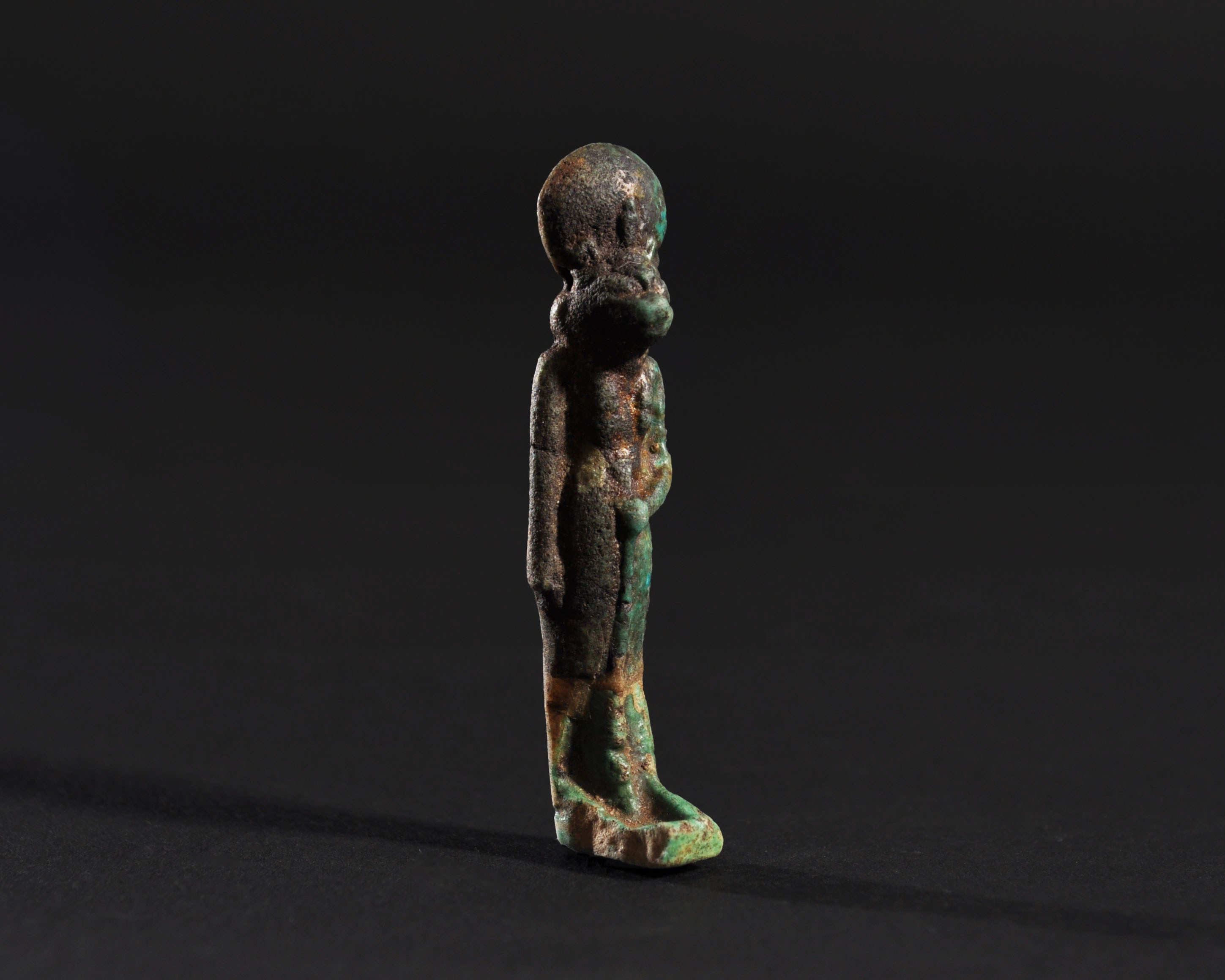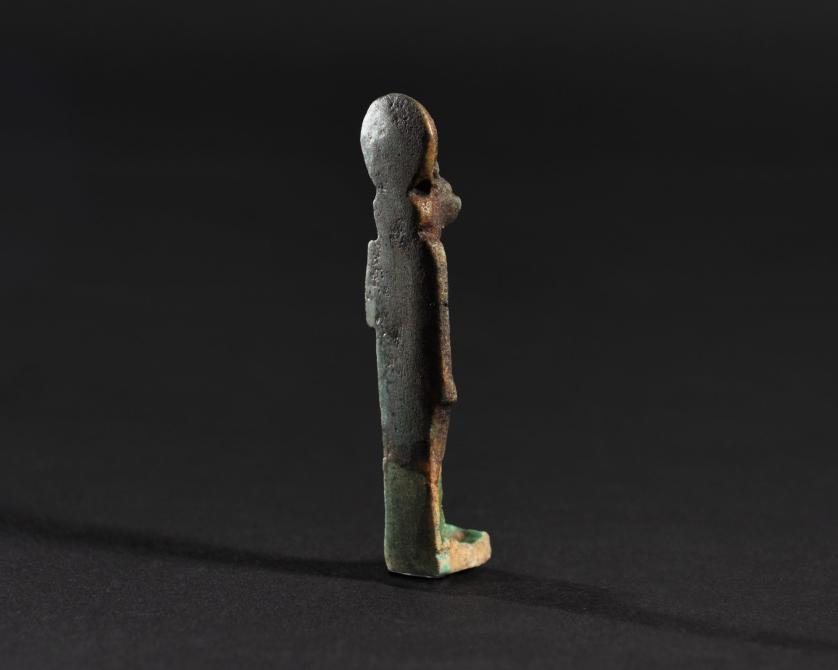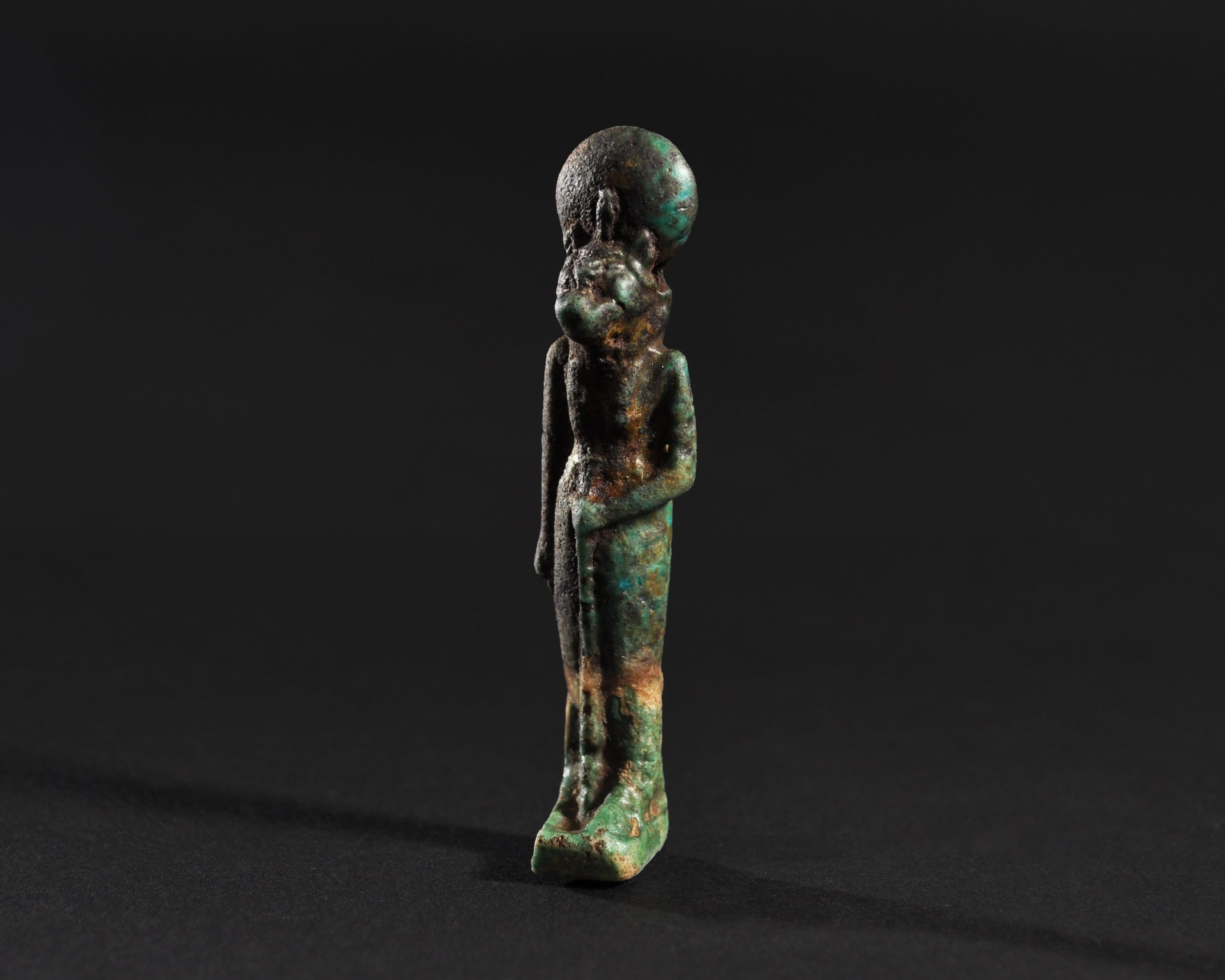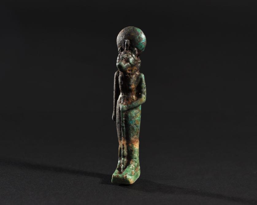 ARQUEOLOGÍA. EGIPTO. Baja Época. Amuleto de la diosa Bastet tocada por disco solar con uraeus (664-332 a.C.). Fayenza. Altura 5,7 cm.