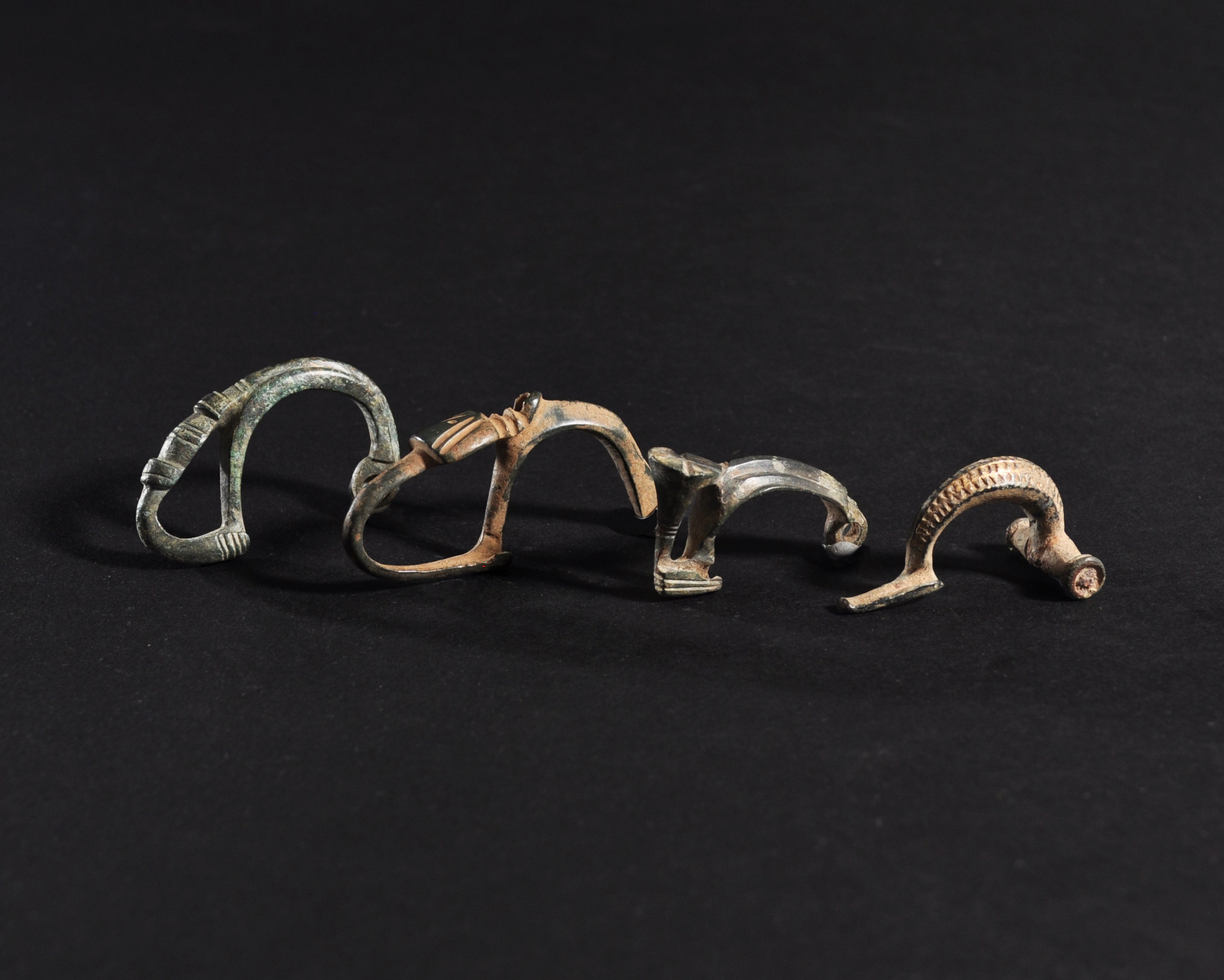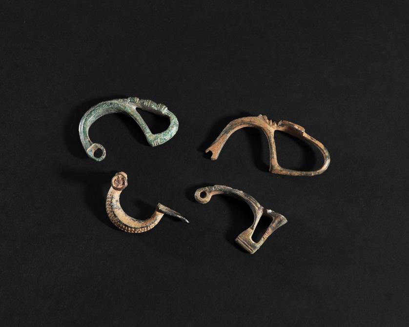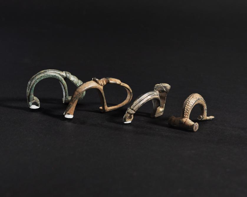 ARQUEOLOGÍA. HISPANIA ANTIGUA. Lote de 4 puentes de fíbulas, tres de ellos con el pie fundido en el puente (ss. IV-I a.C.). Bronce. Longitud de 3,9 a 5,7 cm.