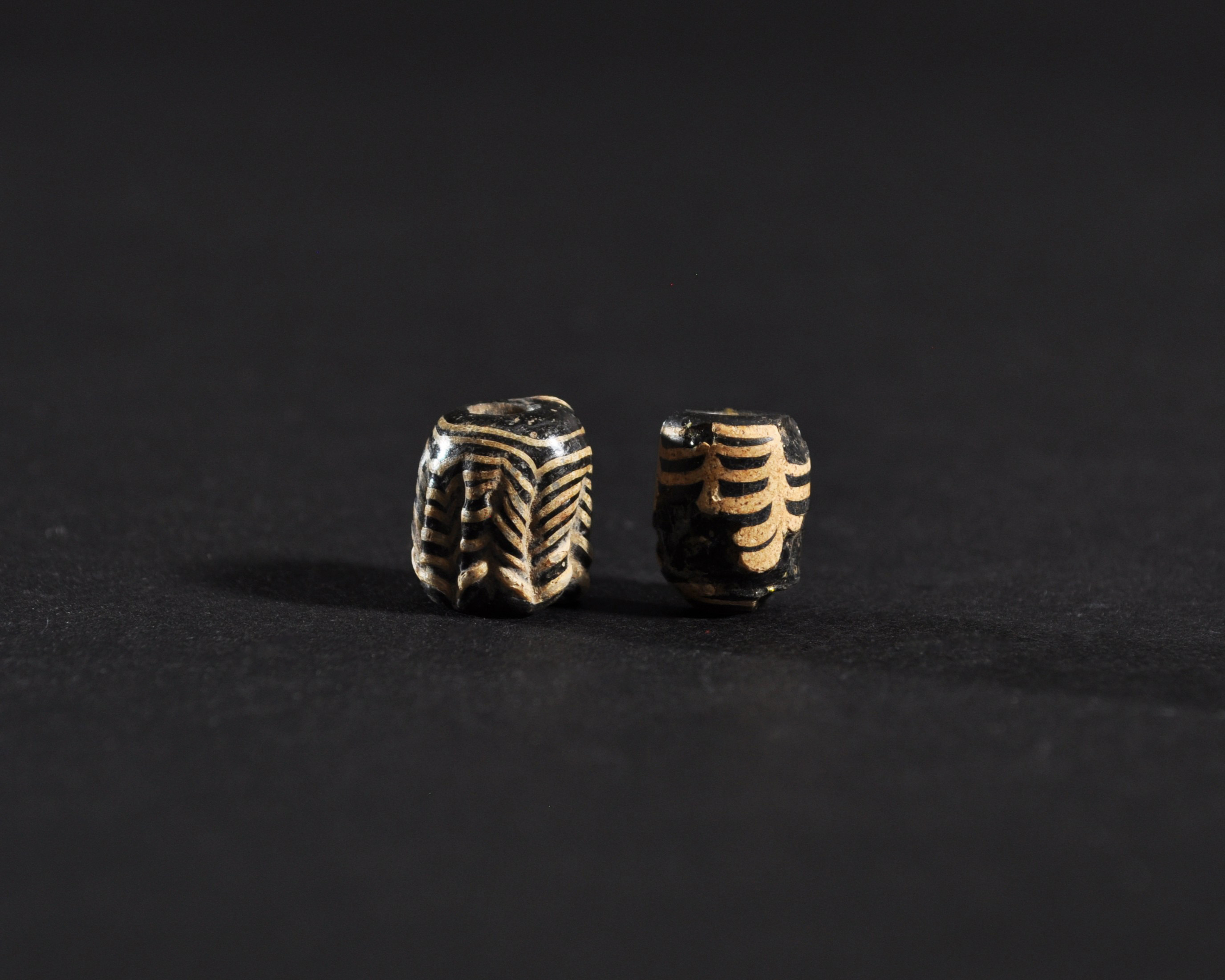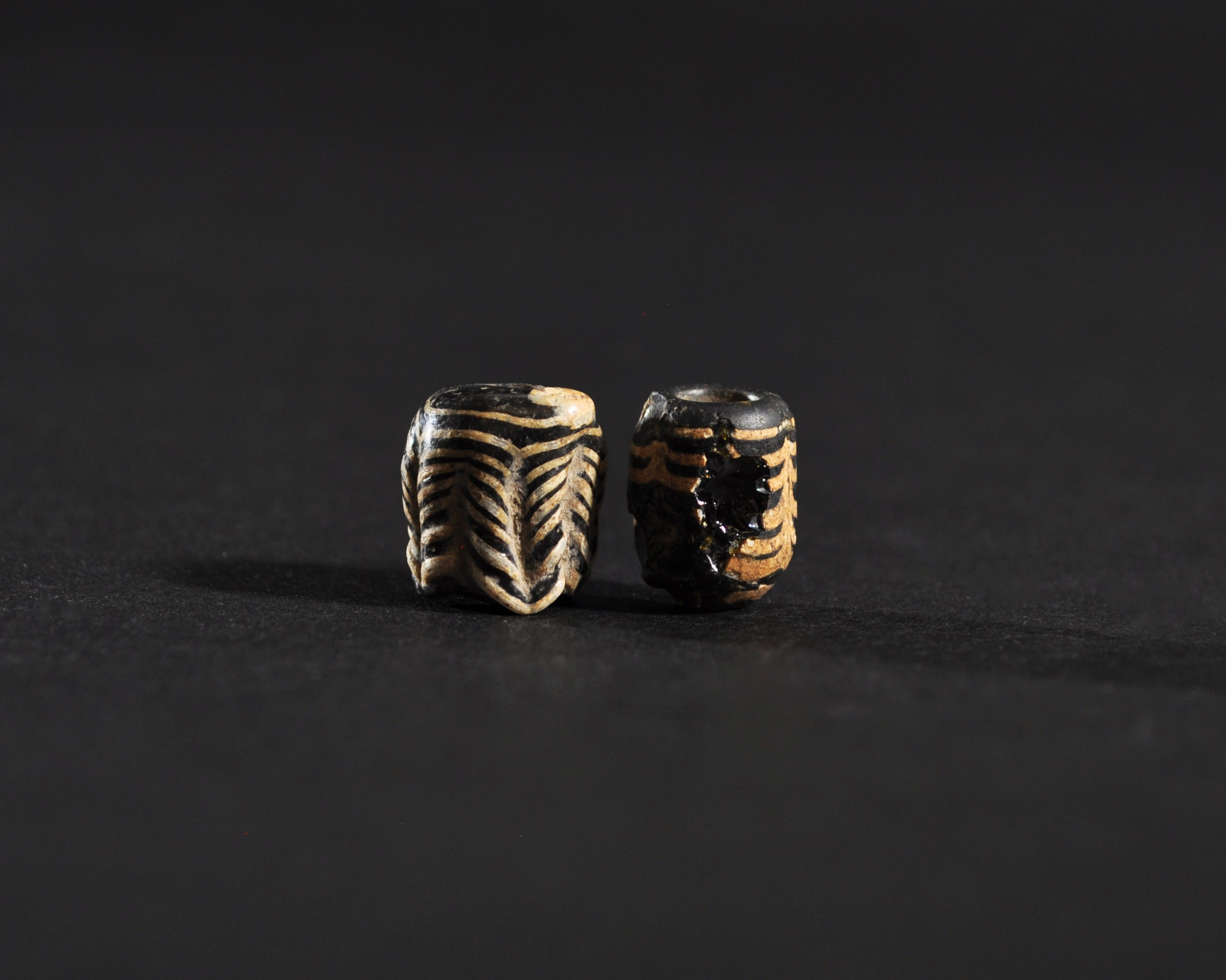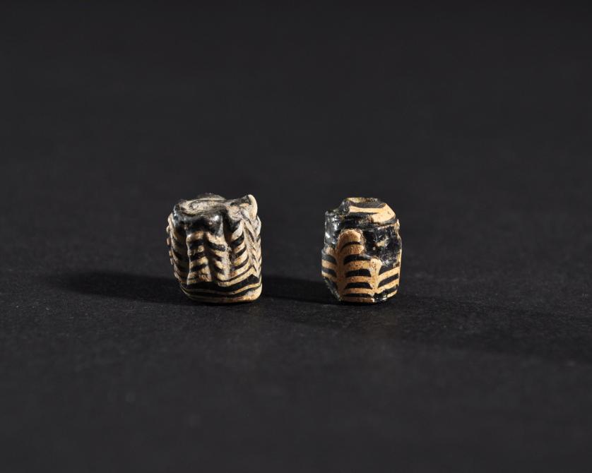 ARQUEOLOGÍA. MUNDO ANTIGUO. Lote de 2 cuentas. Vidrio. Longitud de 1,2 a 1,3 cm.