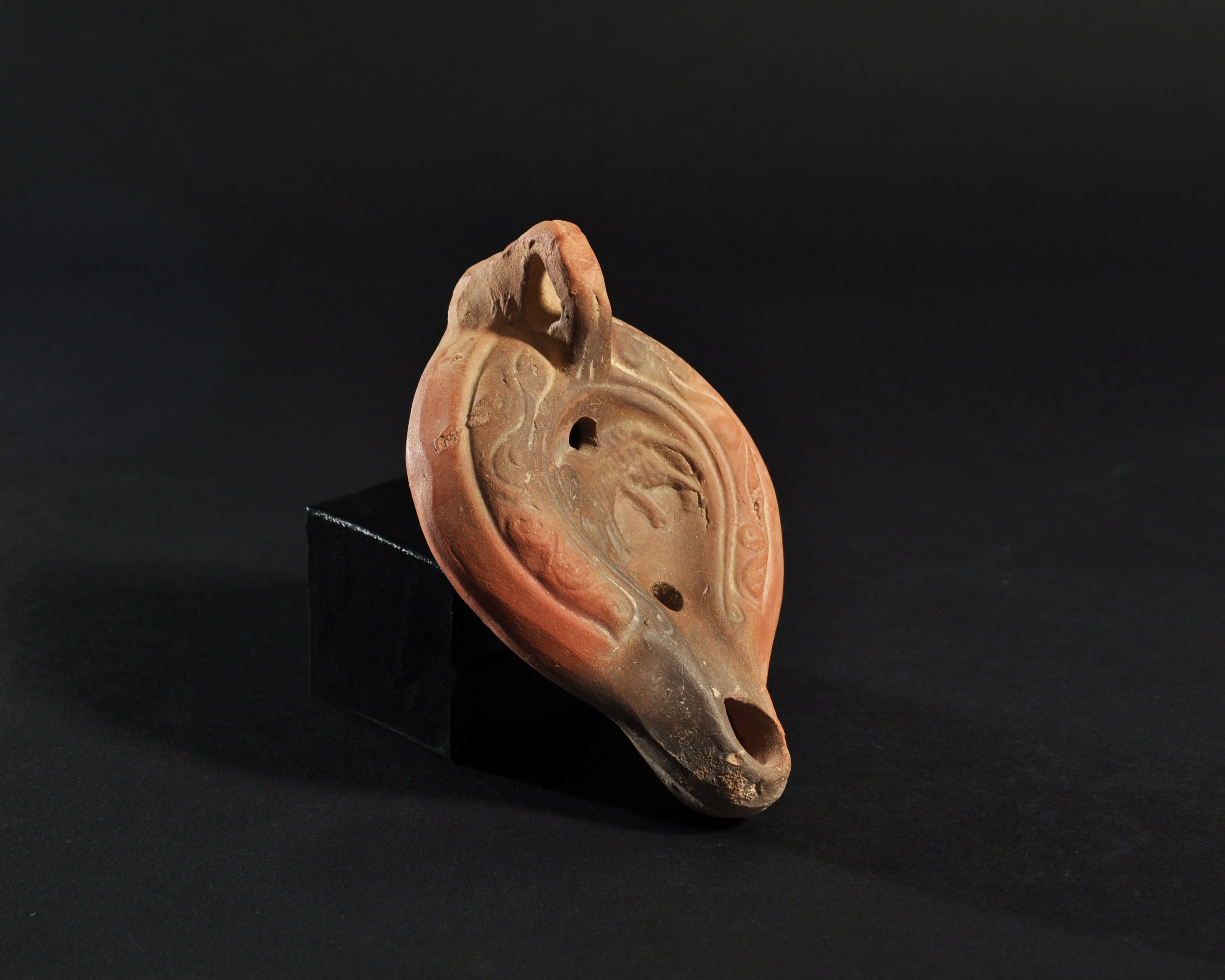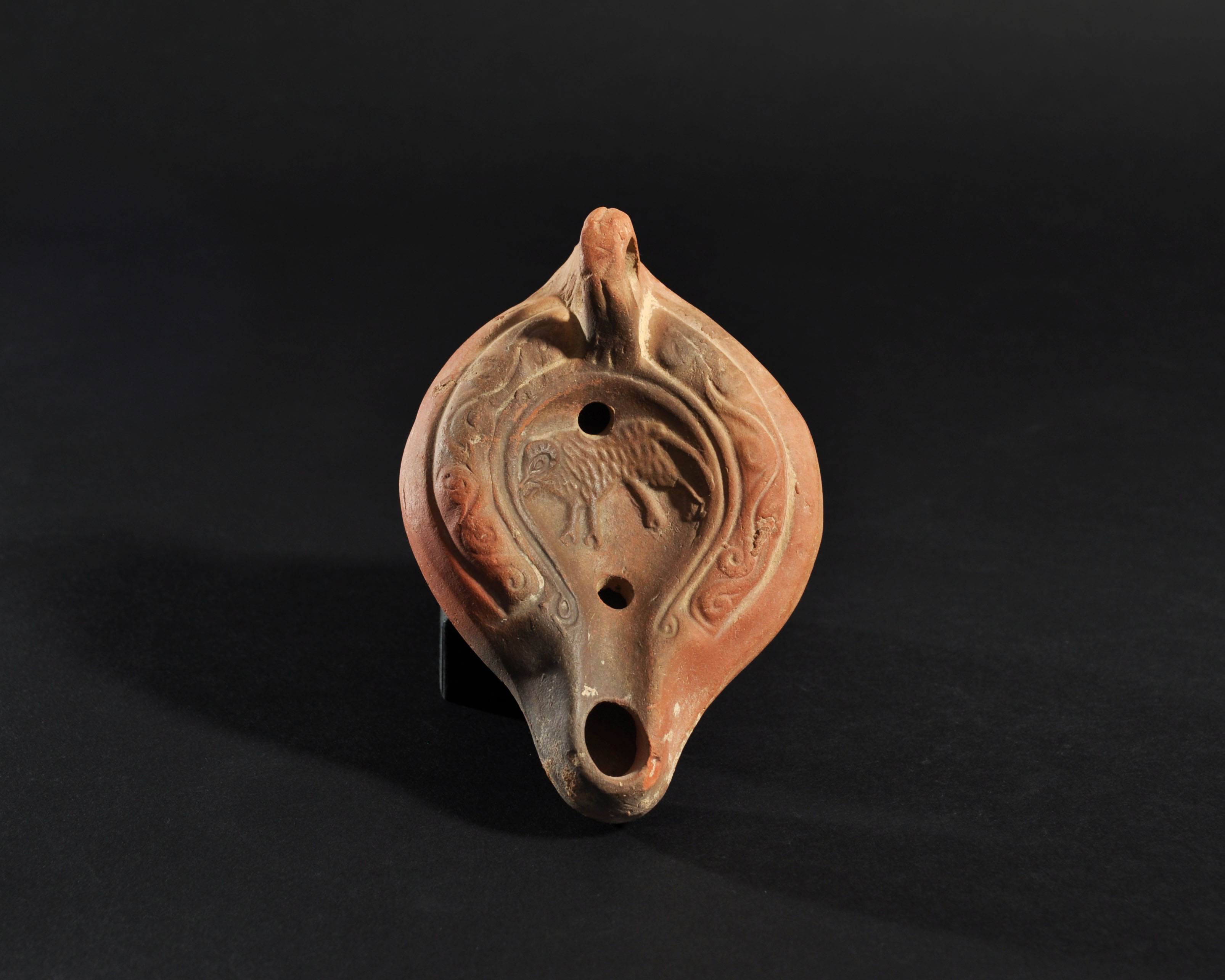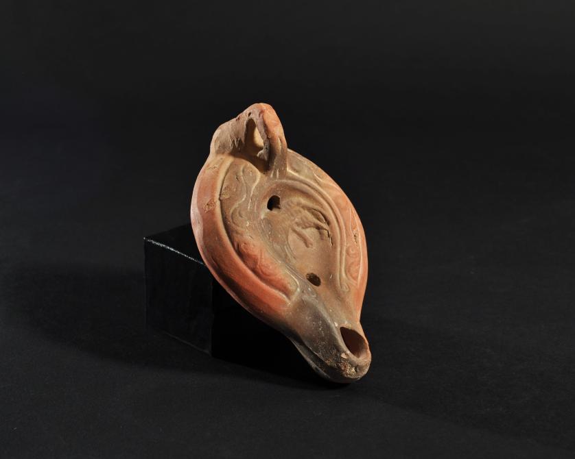 ARQUEOLOGÍA. ROMA. Lucerna con decoración de caprino en el disco (siglo IV d.C.). Terracota. Longitud 12 cm.