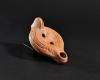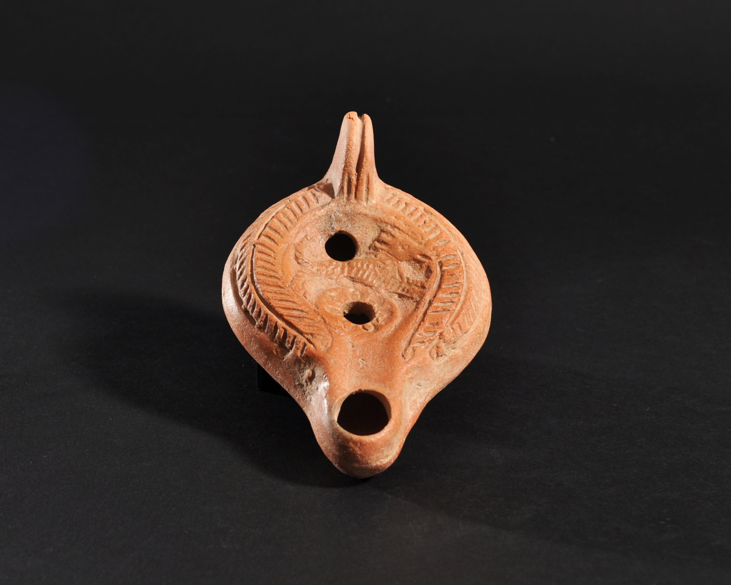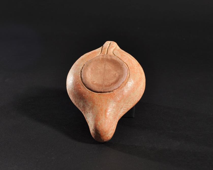 ARQUEOLOGÍA. ROMA. Lucerna con decoración de cuadrúpedo a der. en el disco y motivos lineales en el margo (siglo IV d.C.). Terracota. Longitud 12,5 cm. Presenta restos textiles en la base.