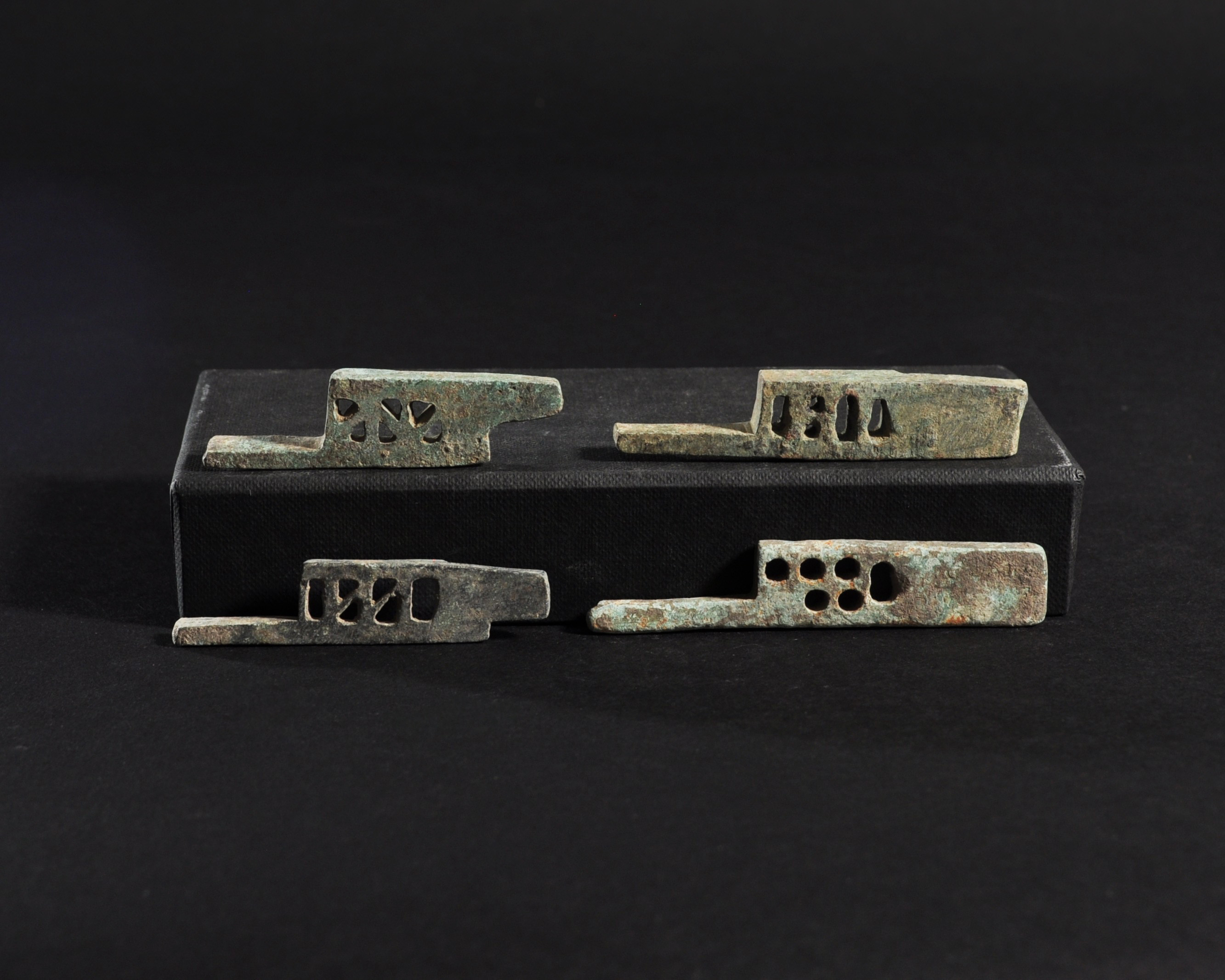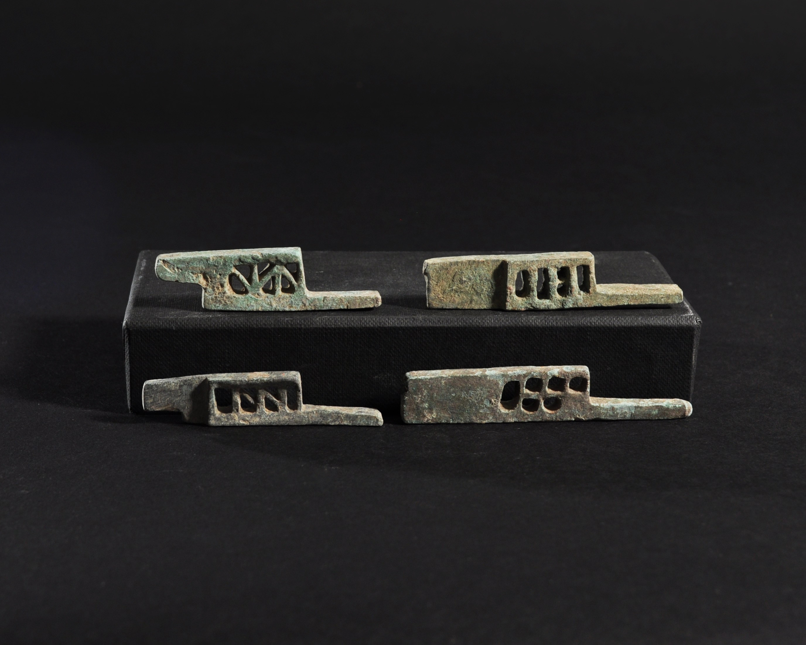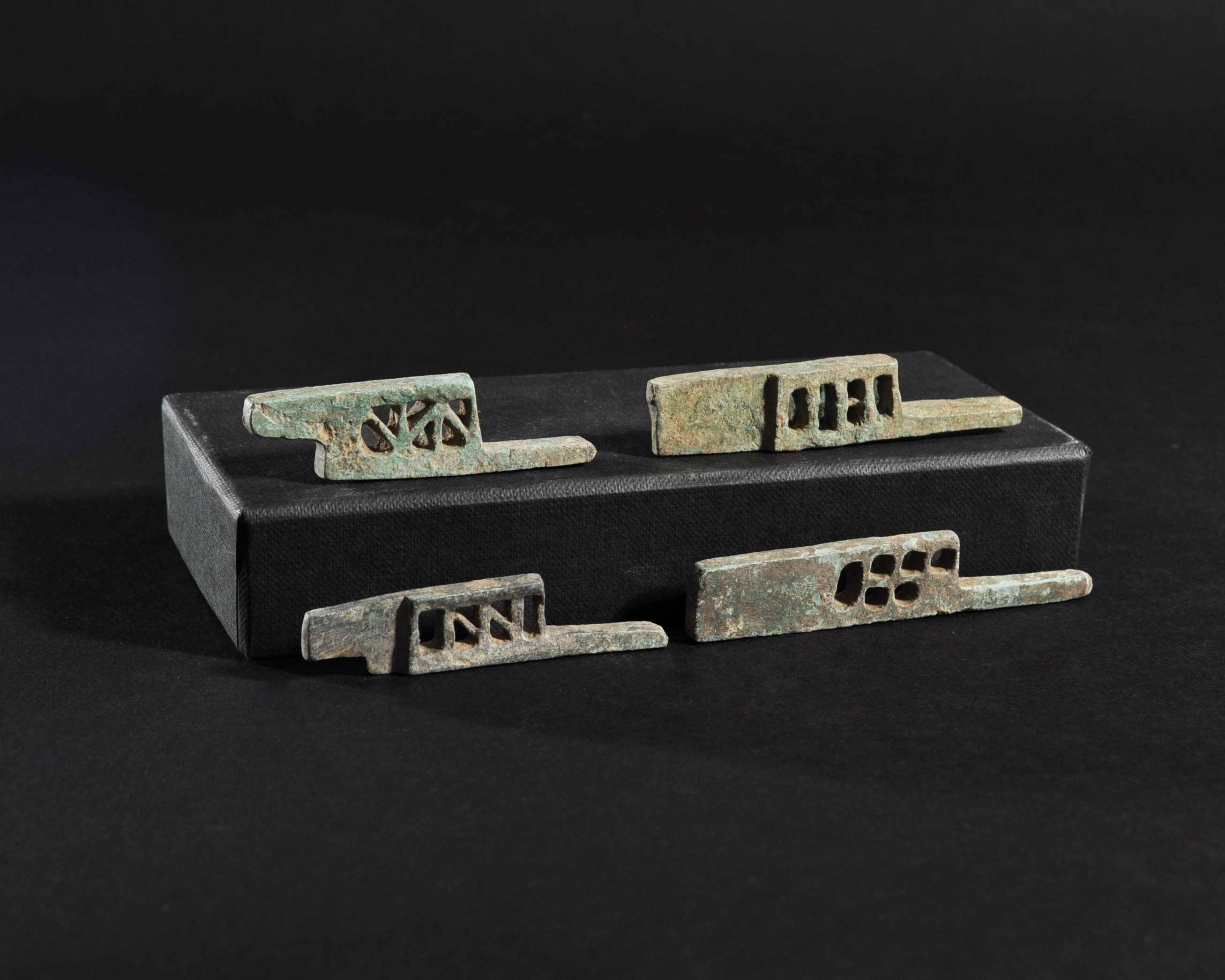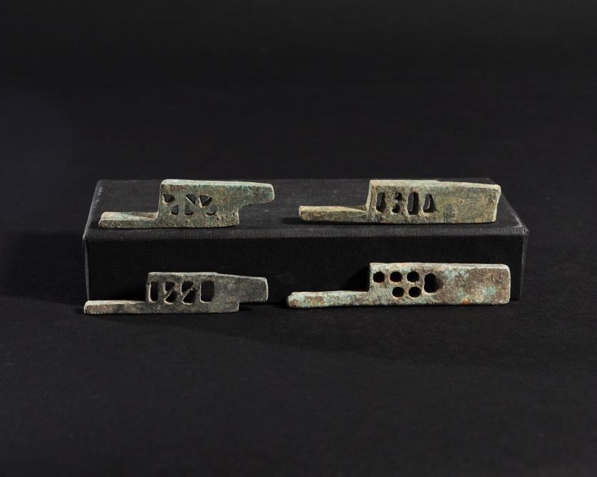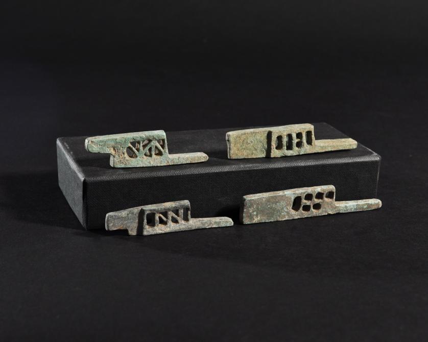 ARQUEOLOGÍA. ROMA. Lote de 4 pestillos (ss. I-IV d.C.). Bronce. Longitud 6,1 a 8 cm.