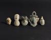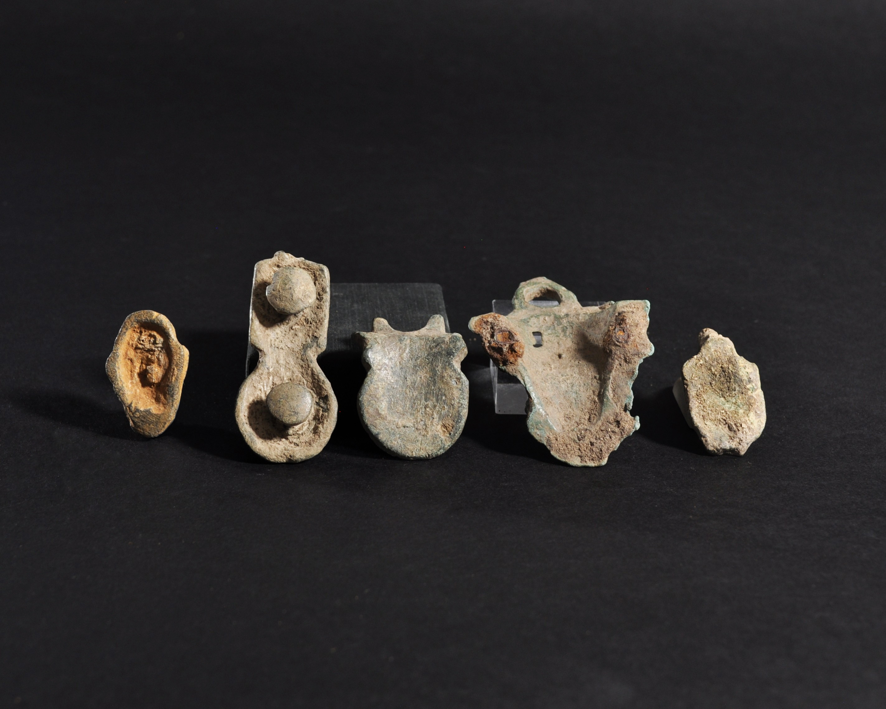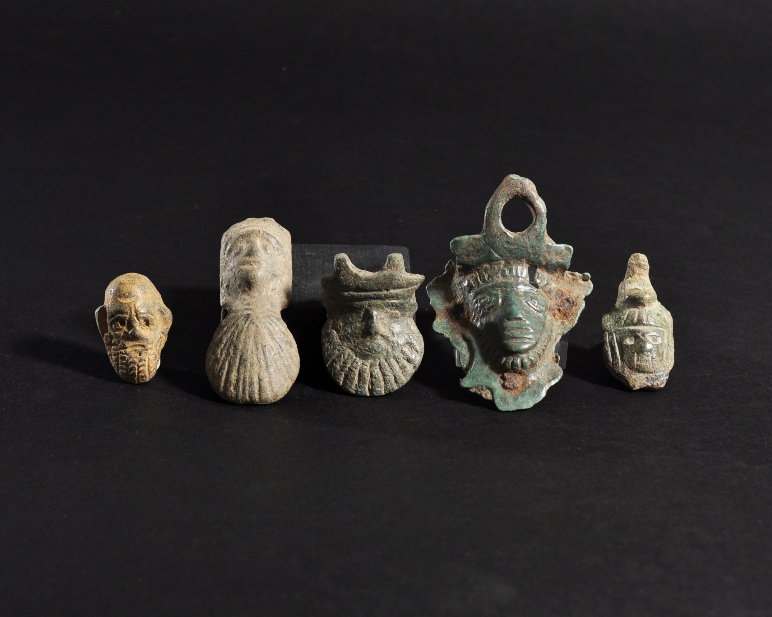 ARQUEOLOGÍA. ROMA. Lote de 5 apliques en forma de rostros (ss. I-IV d.C.). Bronce. Longitud de 2,9 a 6 cm.