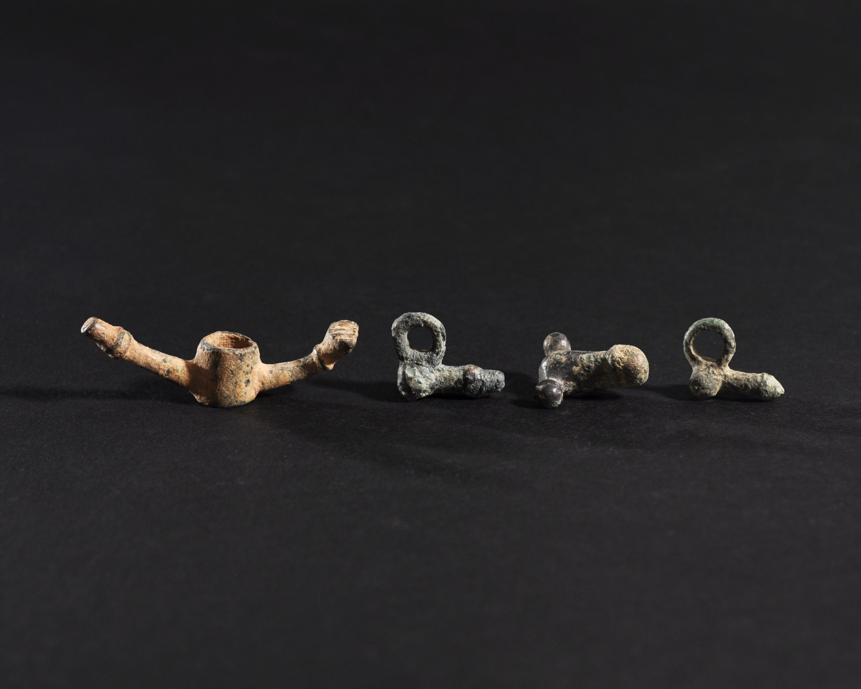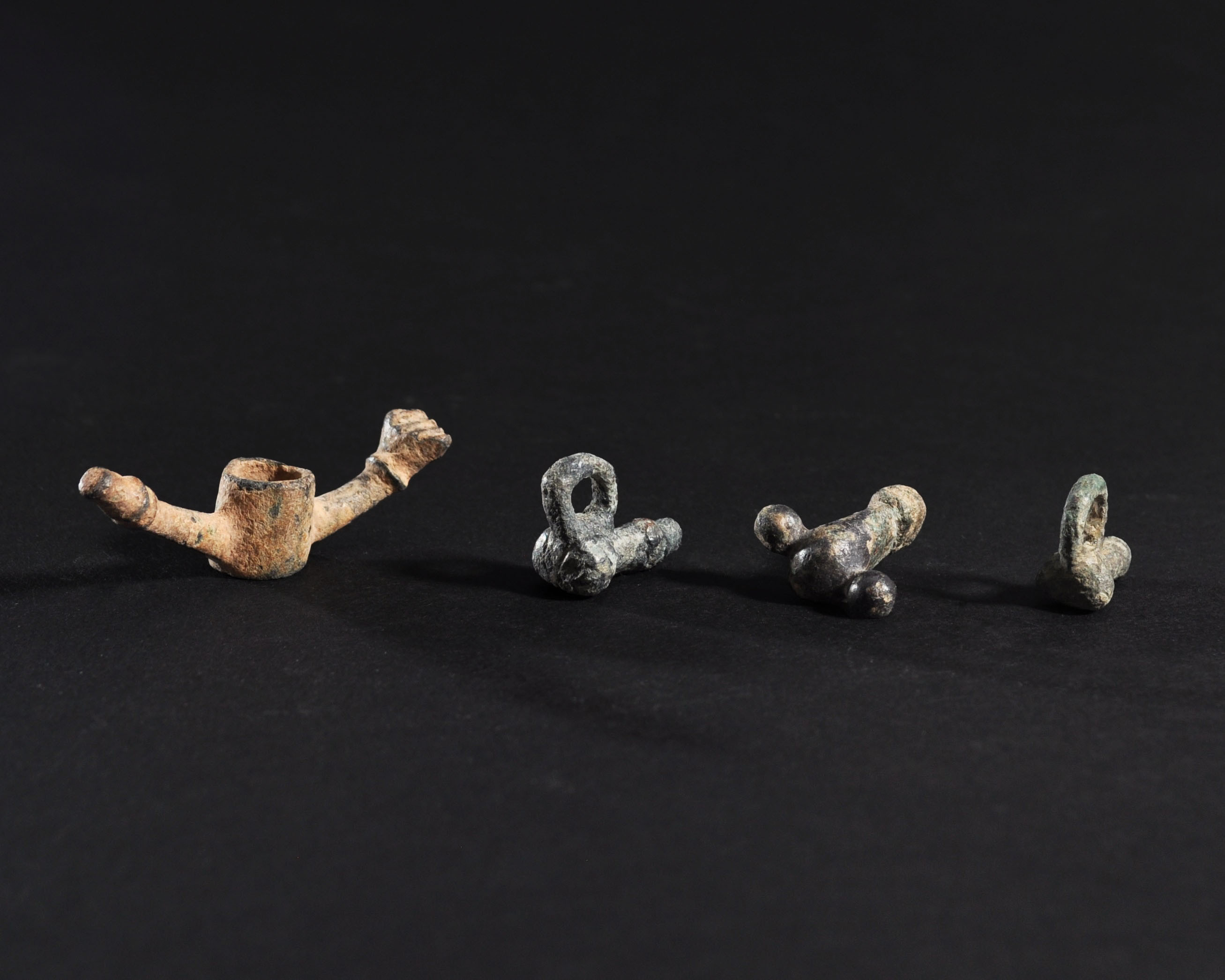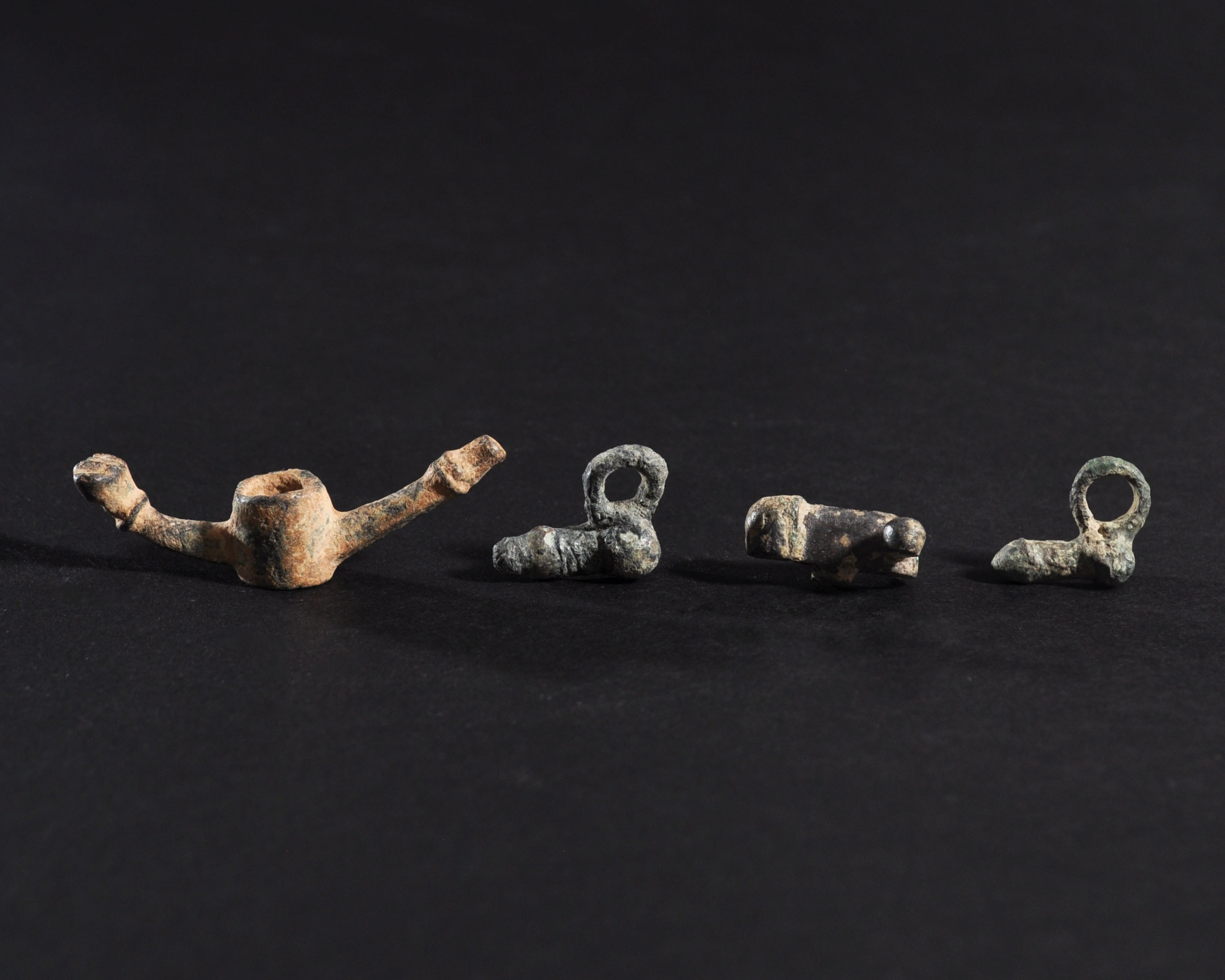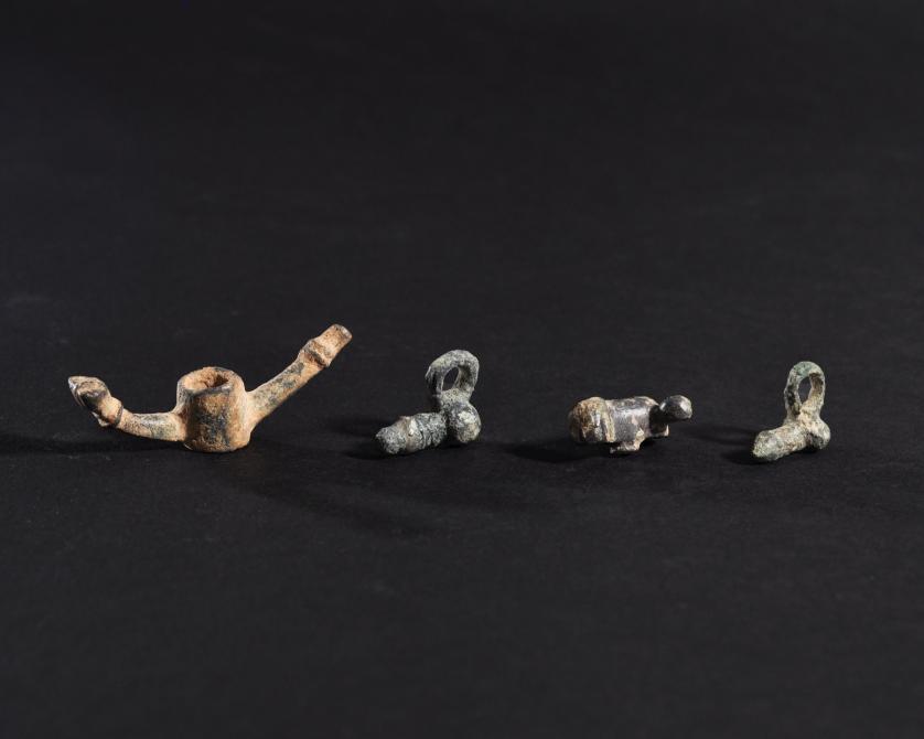 ARQUEOLOGÍA. ROMA. Lote de 4 amuletos fálicos (ss. I-IV d.C.). Bronce. Longitud de 2 a 5,9 cm.