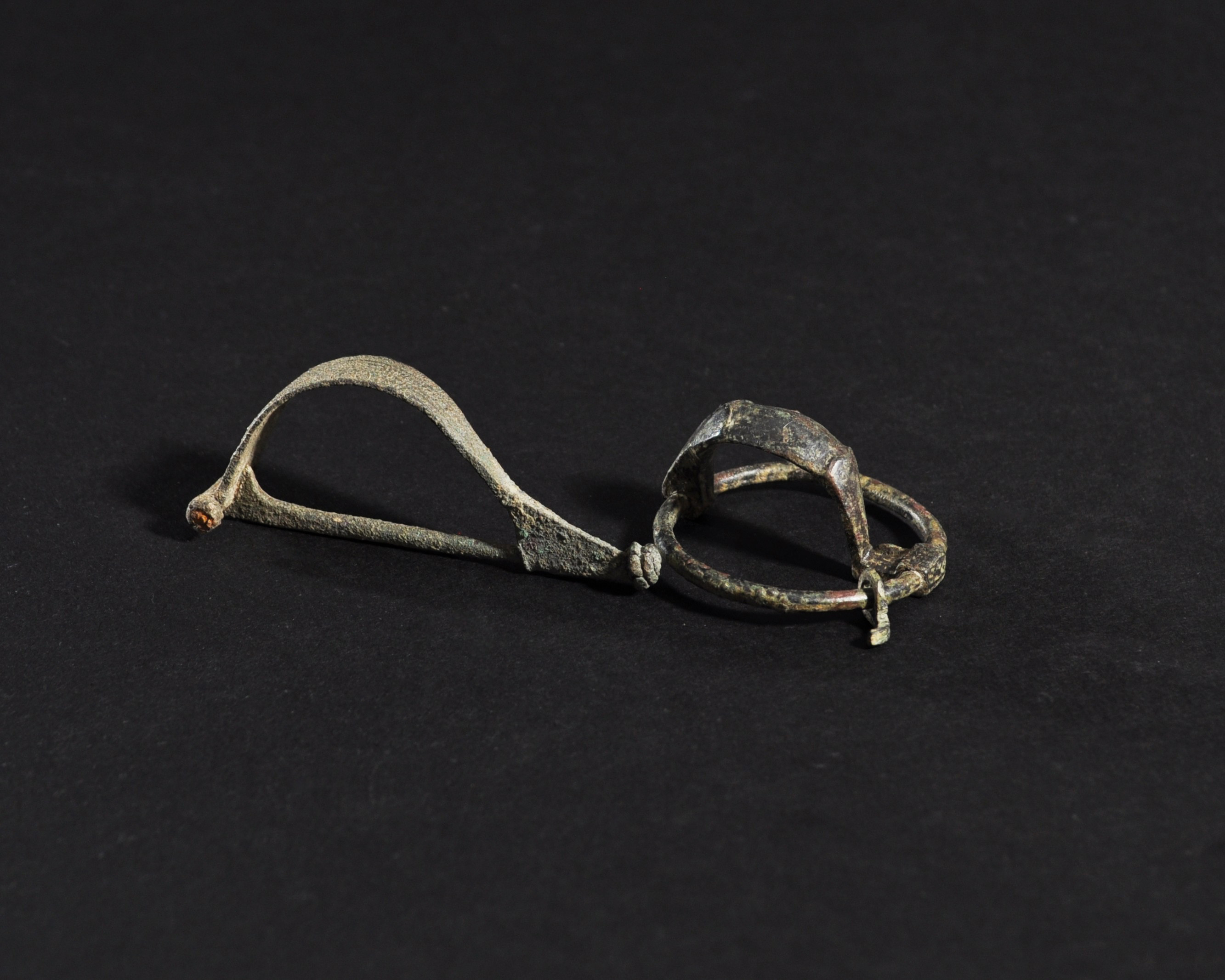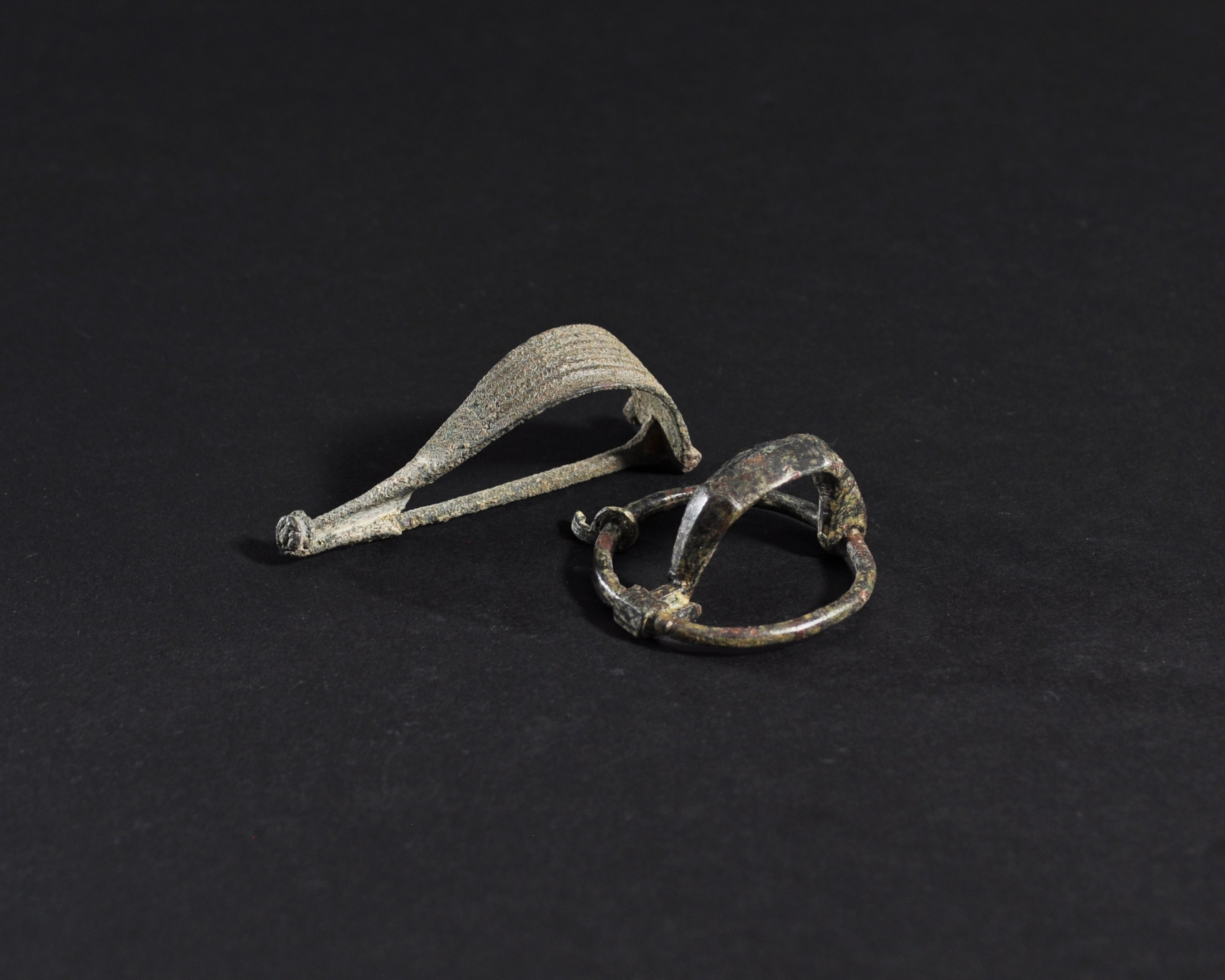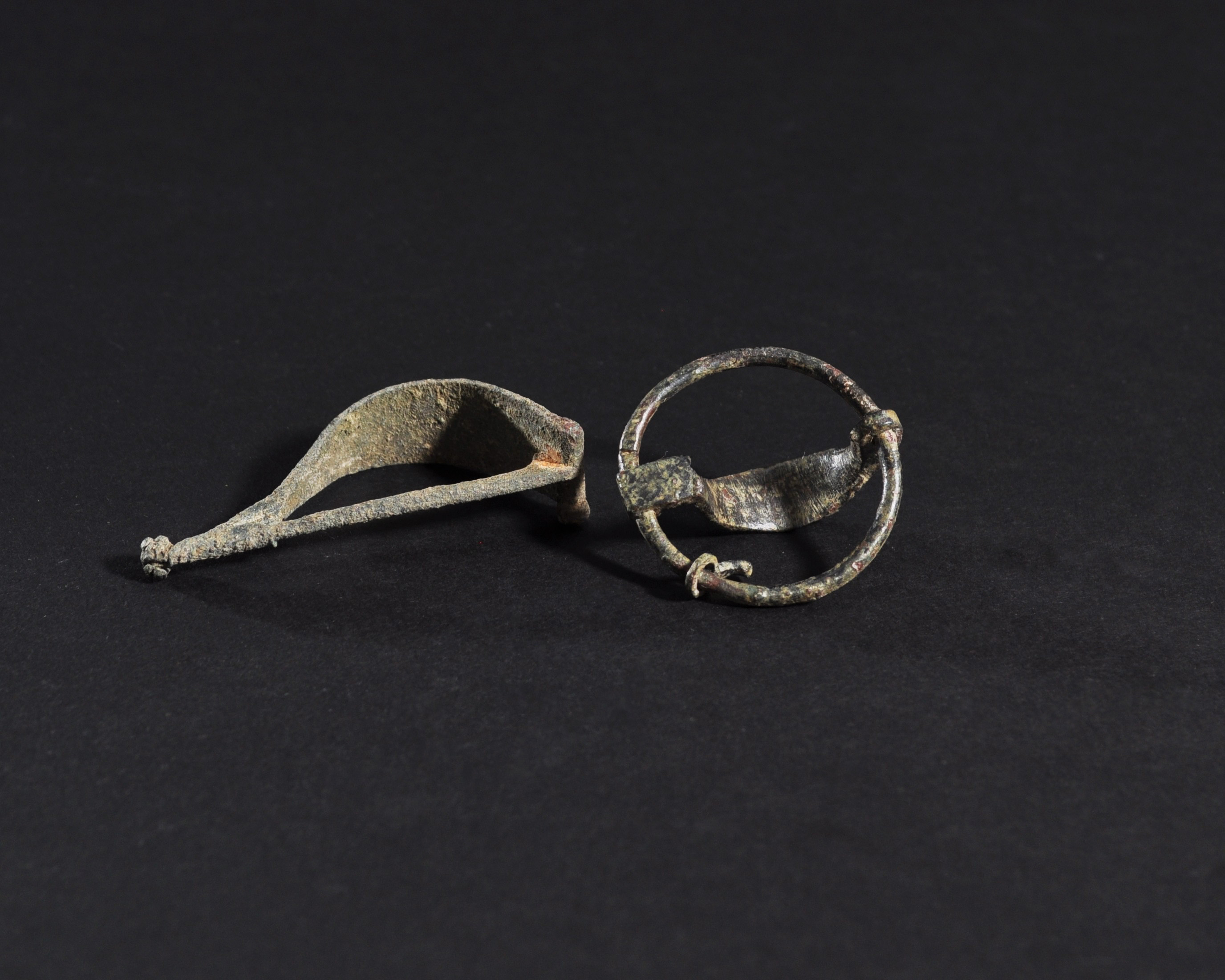 ARQUEOLOGÍA. ROMA. Lote de 2 fíbulas: fíbula anular y fíbula de arco (ss. I-IV d.C.). Bronce. Longitud de 4 a 6,5 cm.