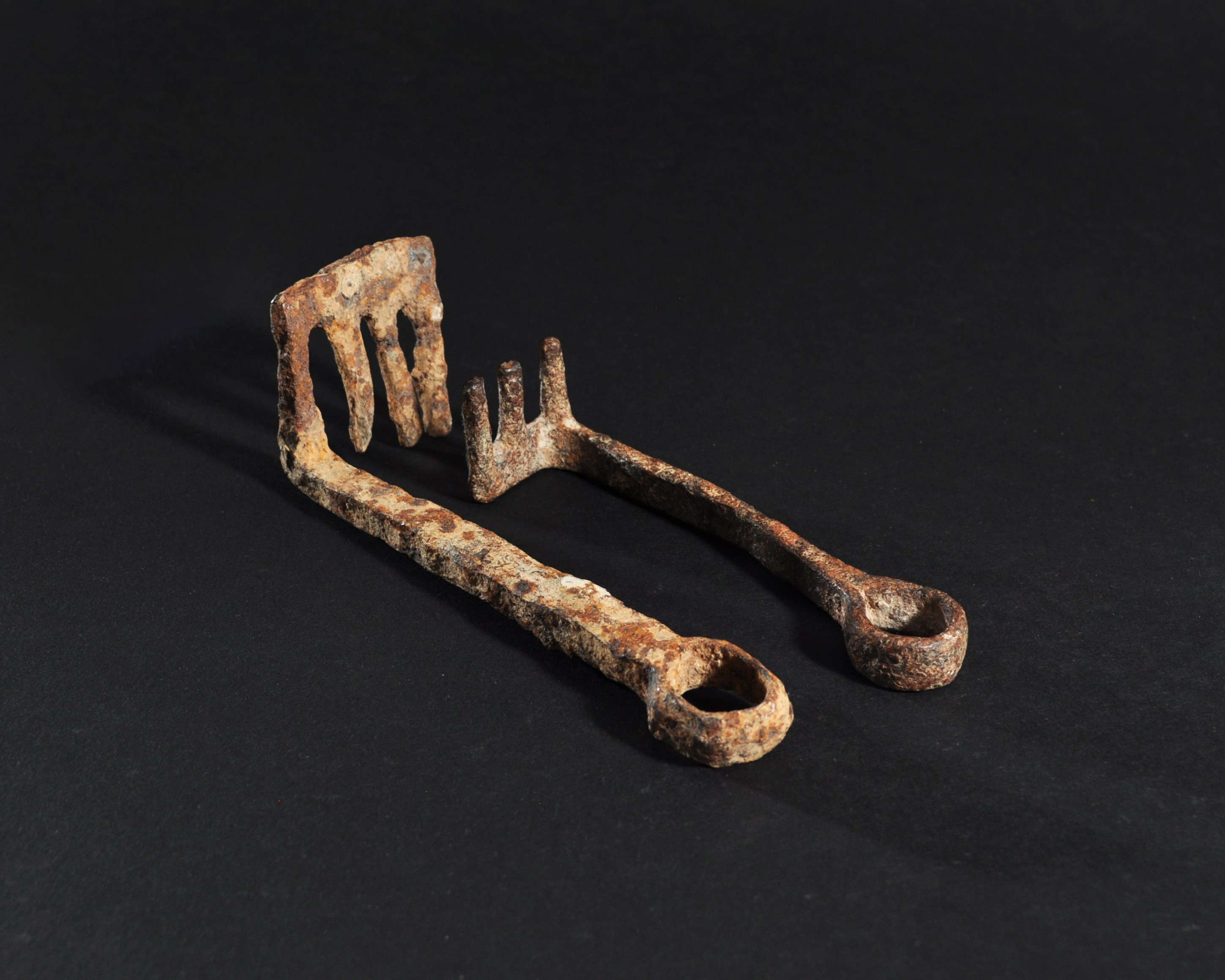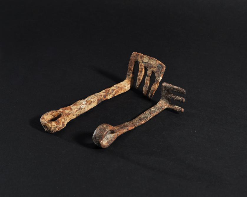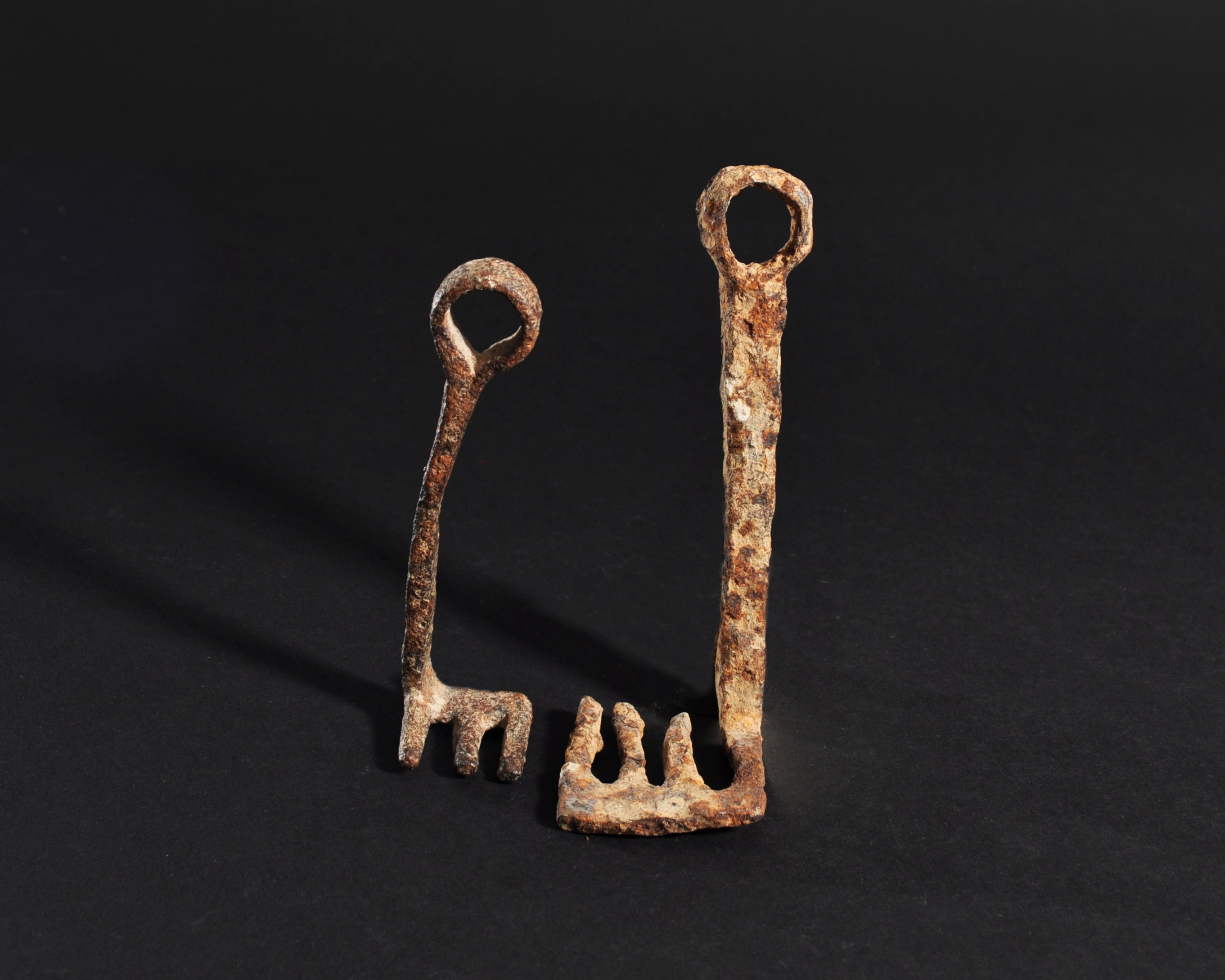ARQUEOLOGÍA. ROMA. Lote de 2 llaves con cabeza de anilla y pie con tres dientes (ss. II-I a.C.). Hierro. Longitud de 11,5 a 14,2 cm.