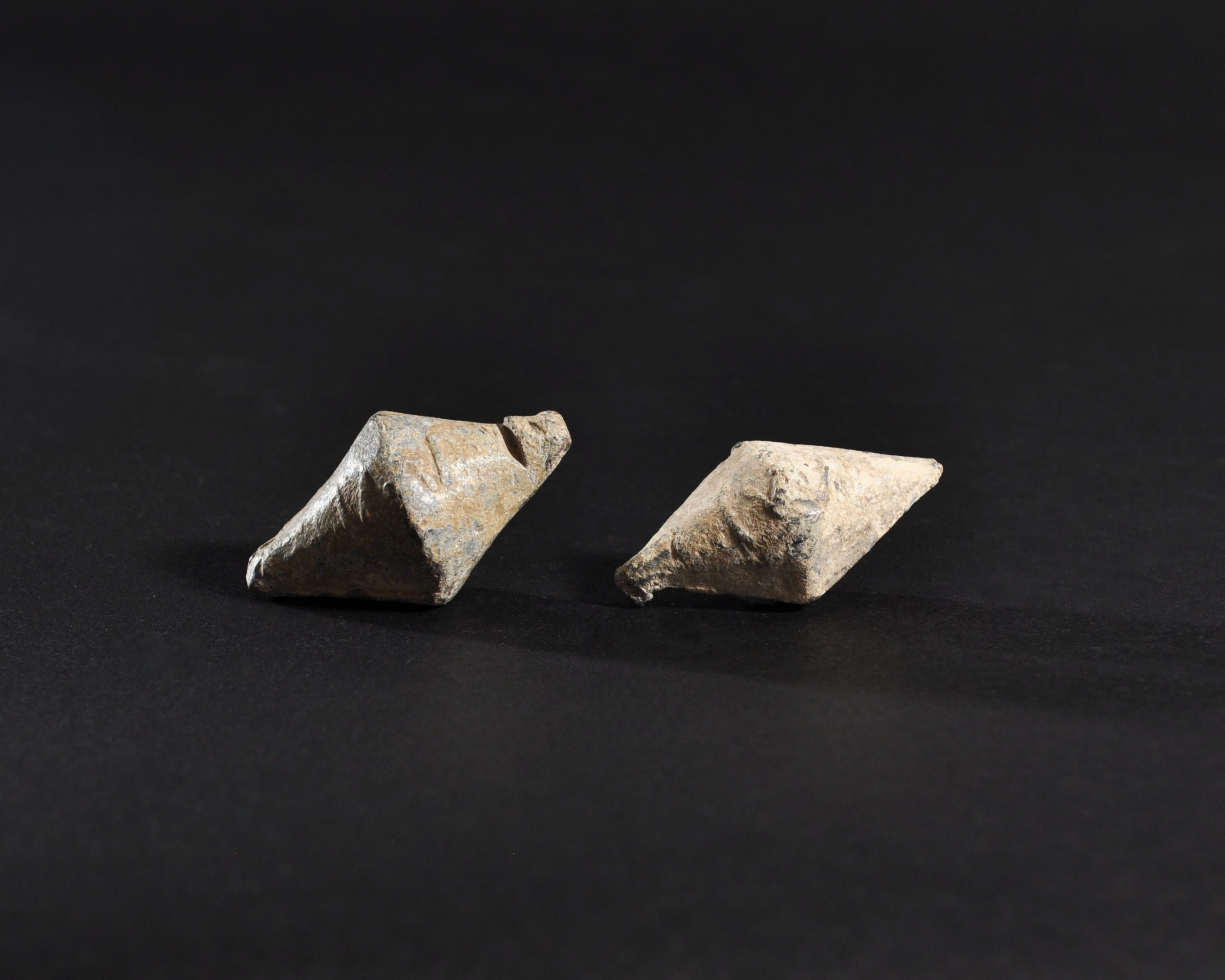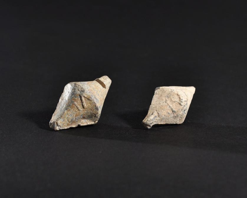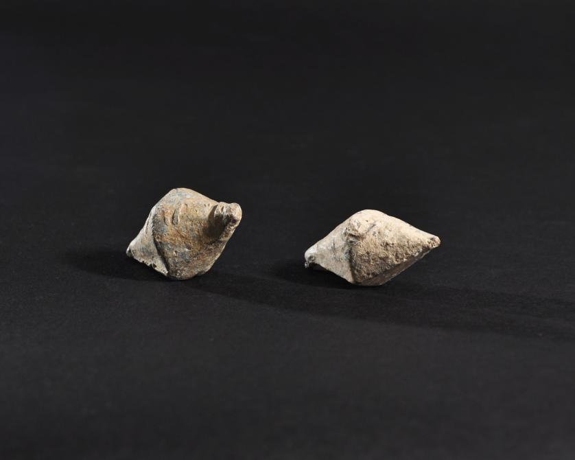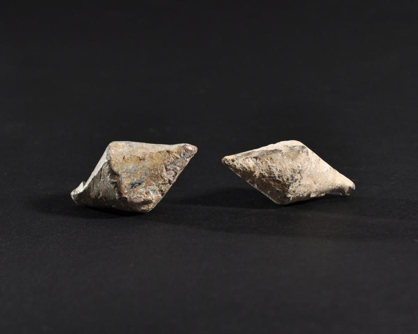 ARQUEOLOGÍA. ROMA. Lote de 2 glandes bicónicos con inscripción (ss. II-I a.C.). Plomo. Longitud de 4,4 a 4,6 cm.