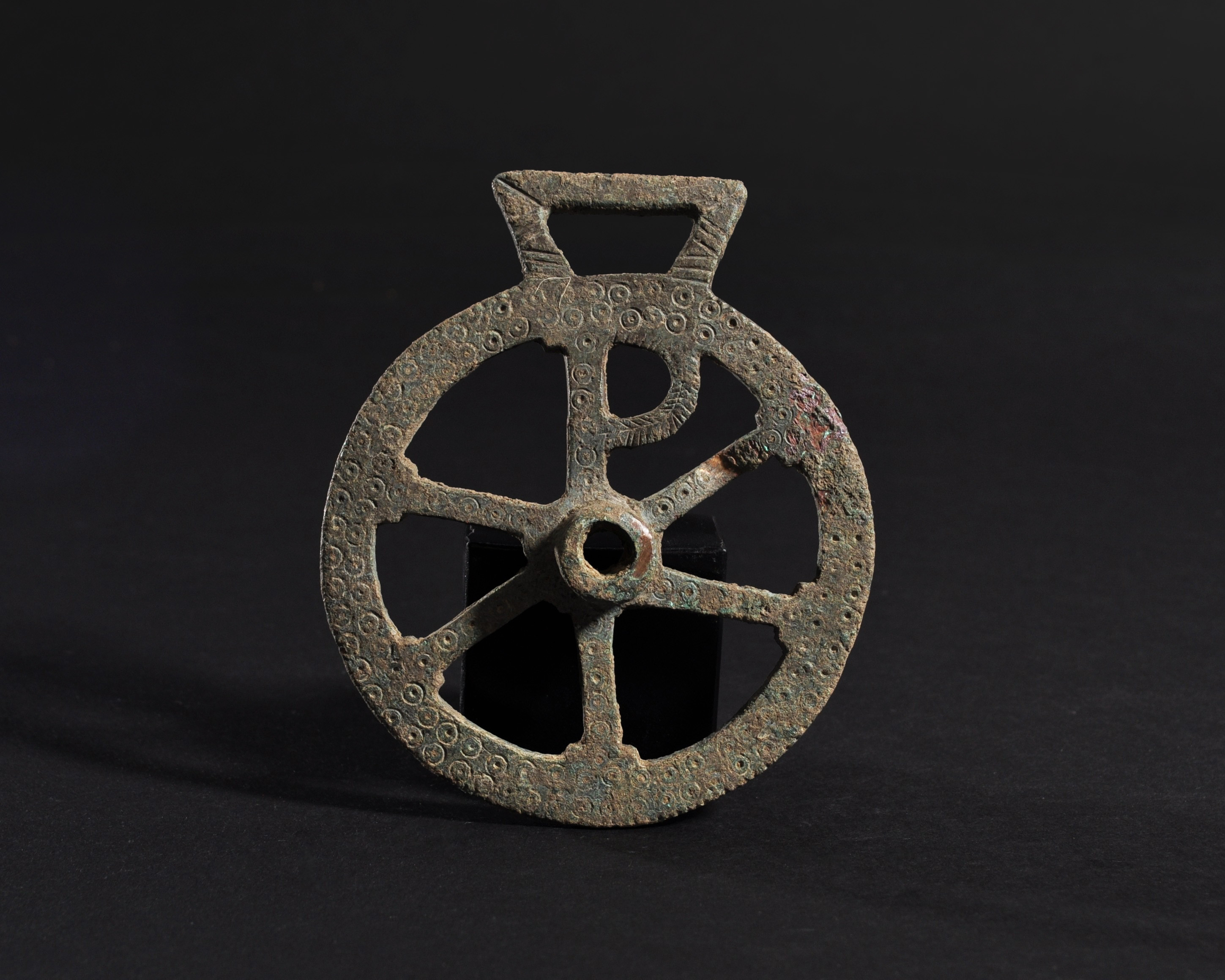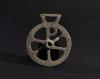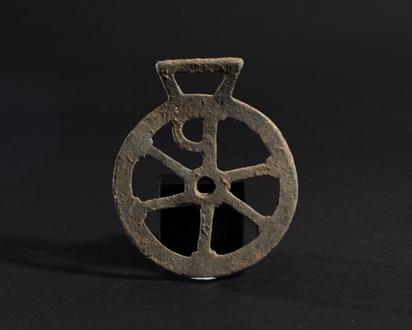 ARQUEOLOGÍA. PALEOCRISTIANO. Cama de bocado de caballo con crismón (ss. IV-V d.C). Bronce. Altura 11,3 cm.