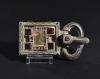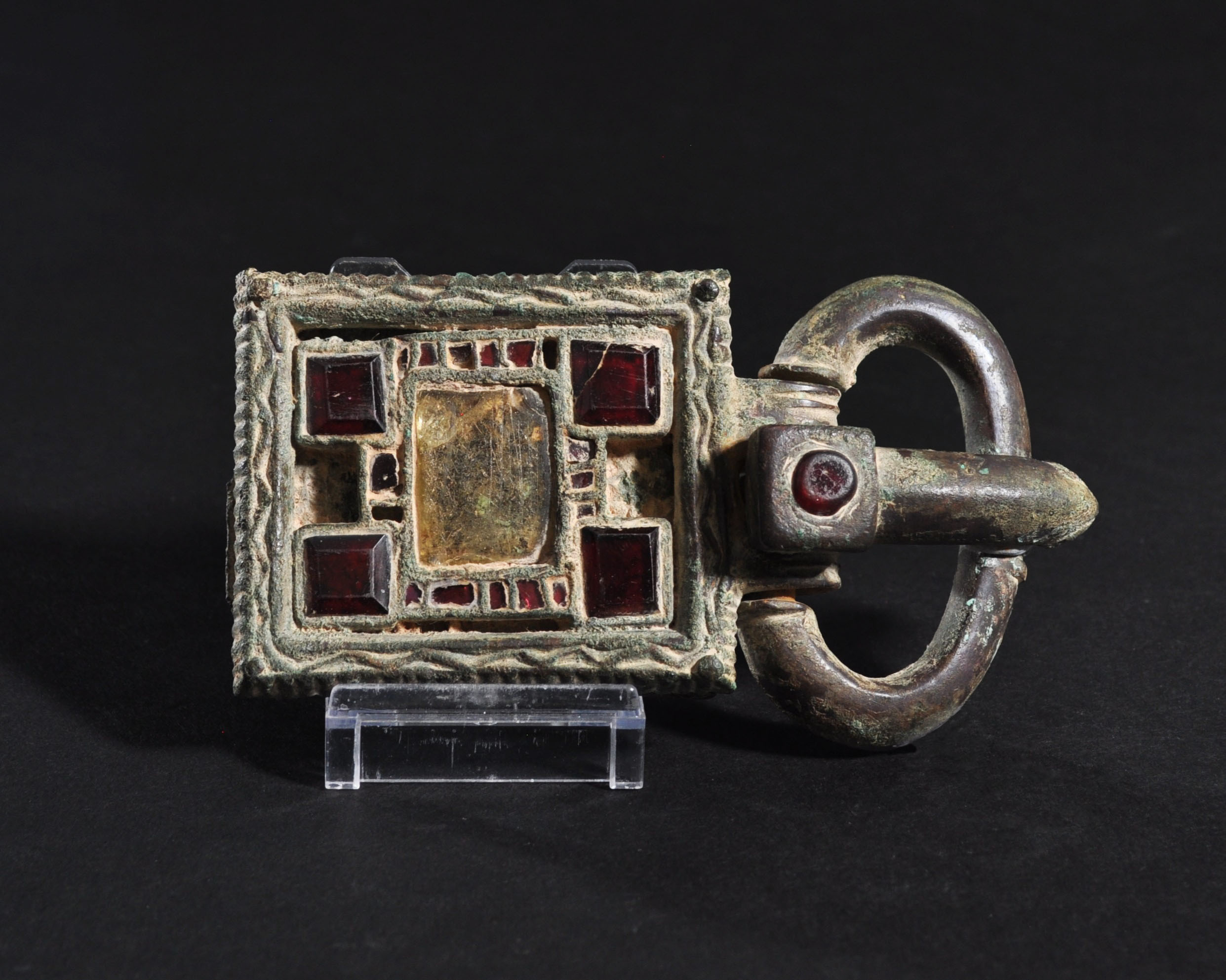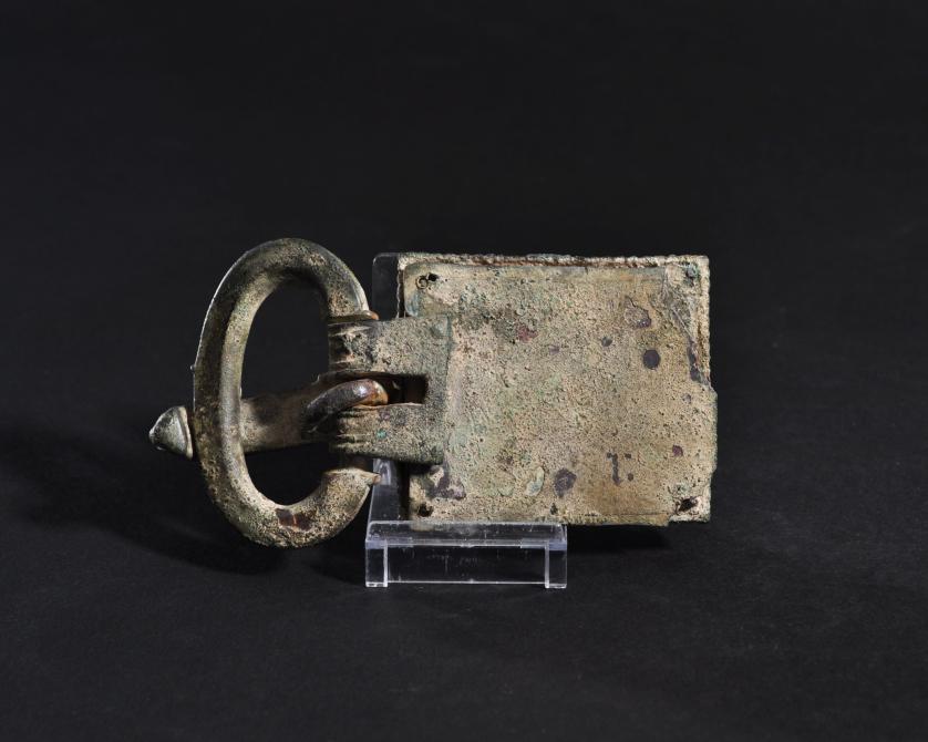 ARQUEOLOGÍA. VISIGODOS. Broche de cinturón de placa rectangular decorada con un marco con línea en zig-zag y un diseño geométrico central de celdillas con vidrios; la hebilla es ovalada y en la aguja se incrusta un cabujón (siglo VI d.C.). Bronce. Longitud 11,5 cm. Pérdida de algunos vidrios y la plancha de fondo presenta faltas.