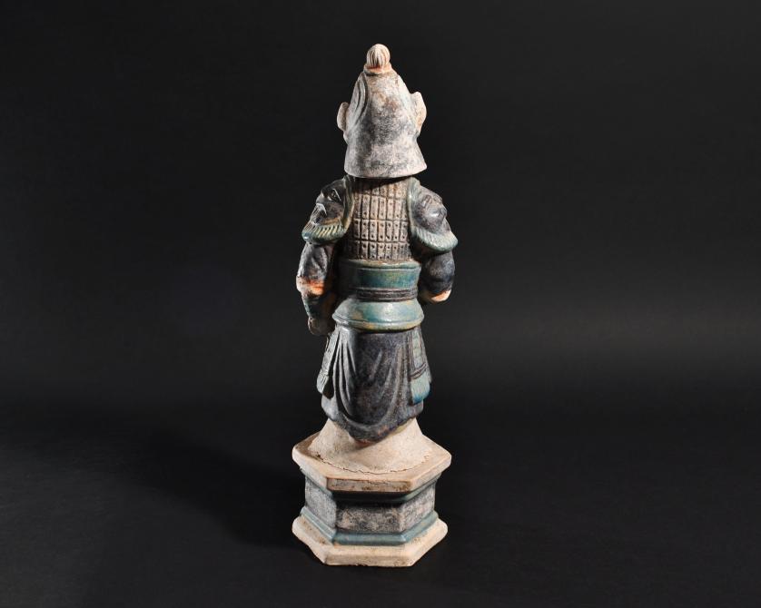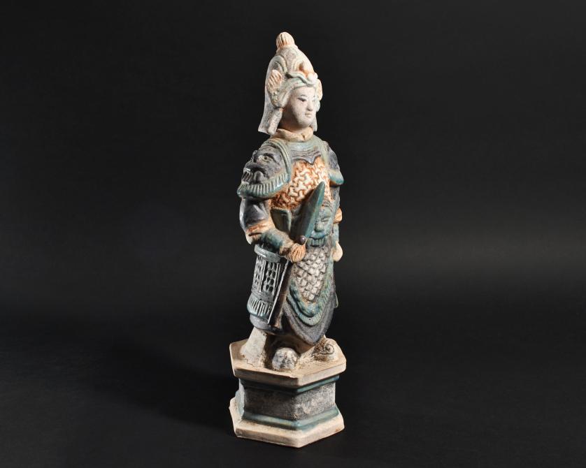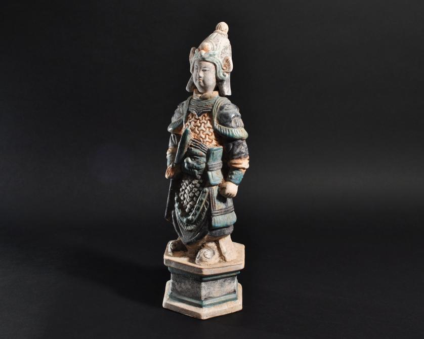 ARQUEOLOGÍA. CHINA. Dinastía Ming. Figura de soldado con cabeza desmontable (1368-1644). Terracota vidriada. Altura 36,6 cm. Fragmentado y restaurado.