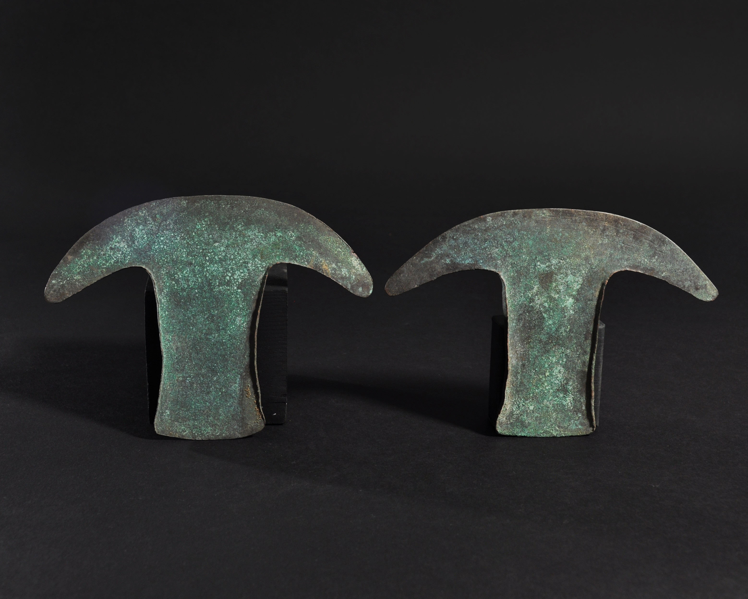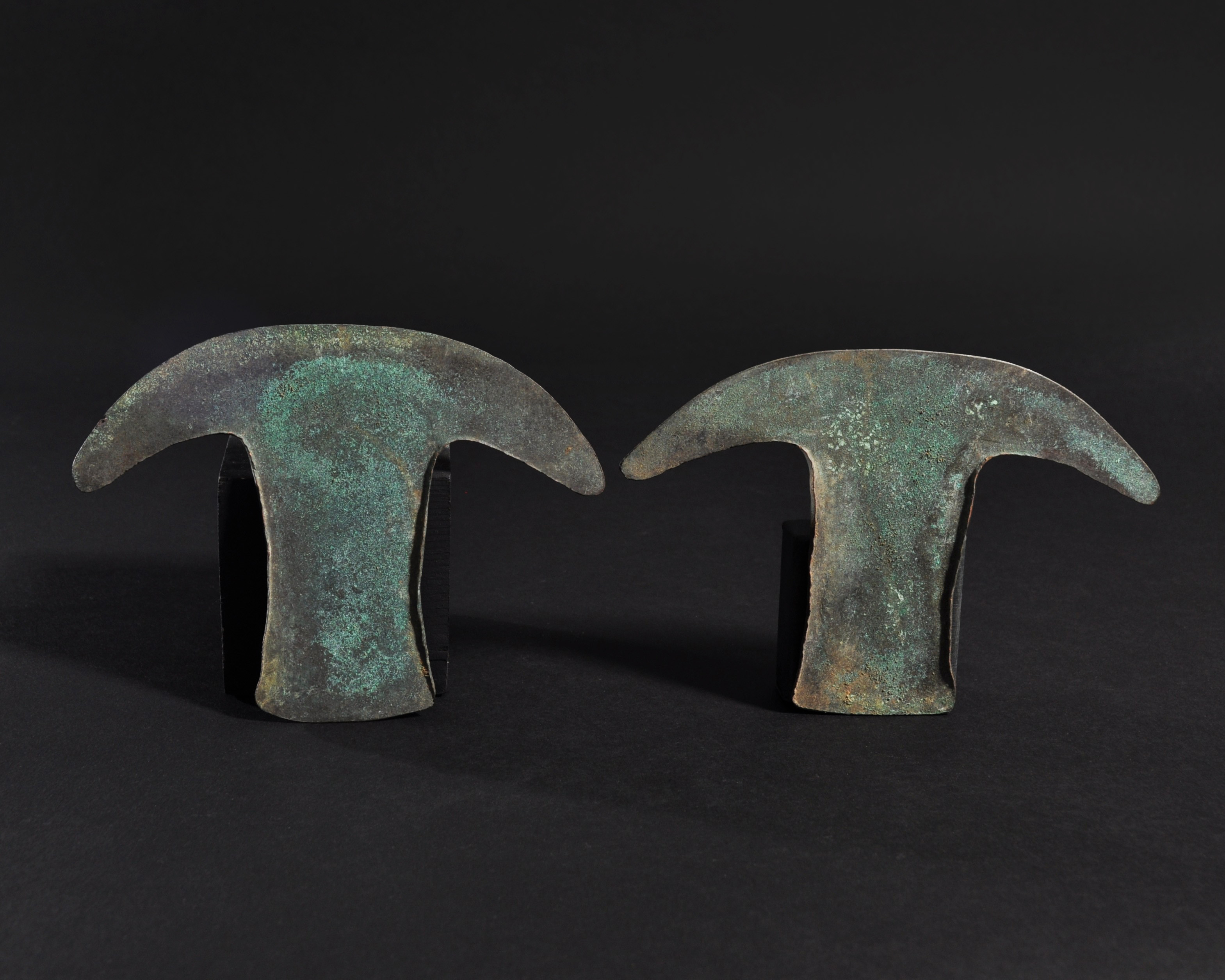 ARQUEOLOGÍA. PREHISPÁNICO. Cultura Azteca. Lote de 2 tajaderas (1000-1500). Cobre. Longitud de 10,8 a 11,2 cm.