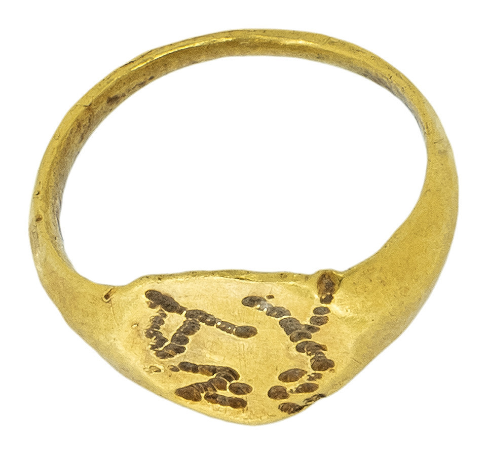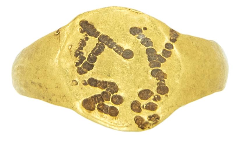 ARQUEOLOGÍA. ROMA. Anillo imperial de aro liso, engrosado en la parte superior, donde presenta una inscripción griega en dos líneas trazada en puntillado (¿ss. I-III d.C.?). Oro. Longitud 13,5 mm. 1,33 gr.