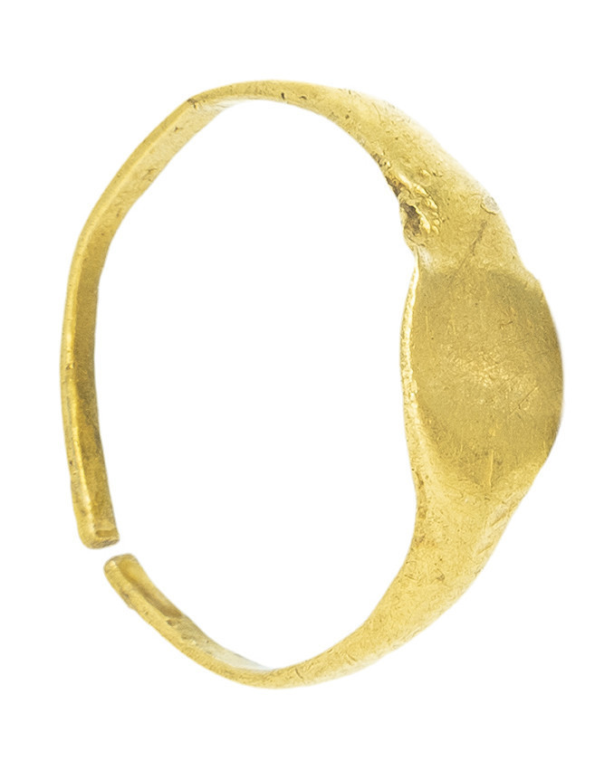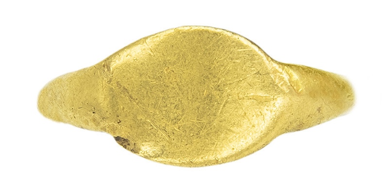 ARQUEOLOGÍA. ROMA. Anillo de aro liso y sello ovalado sin grabar (¿ss. I-II d.C.?). Oro. Longitud 16,8 mm. 1,35 gr. El aro está abierto.