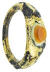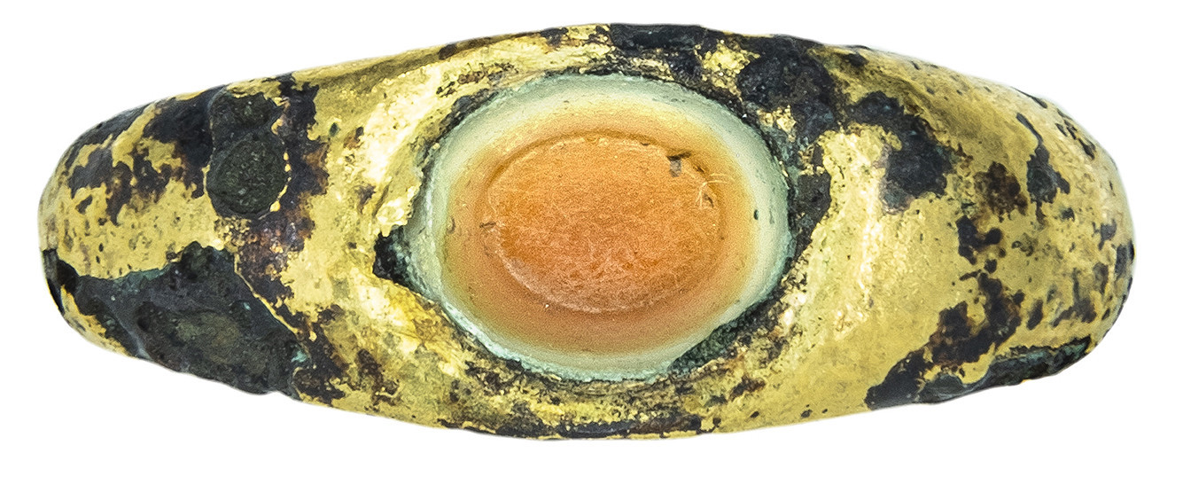 ARQUEOLOGÍA. ROMA. Anillo de aro ligeramente engrosado y aplanado en su parte superior, donde se inserta un entalle troncocónico (ss. II-III d.C.). Cobre chapado en oro y ágata bicolor blanca y naranja. Longitud 23,4 mm. 4,96 gr.