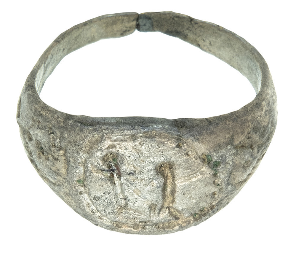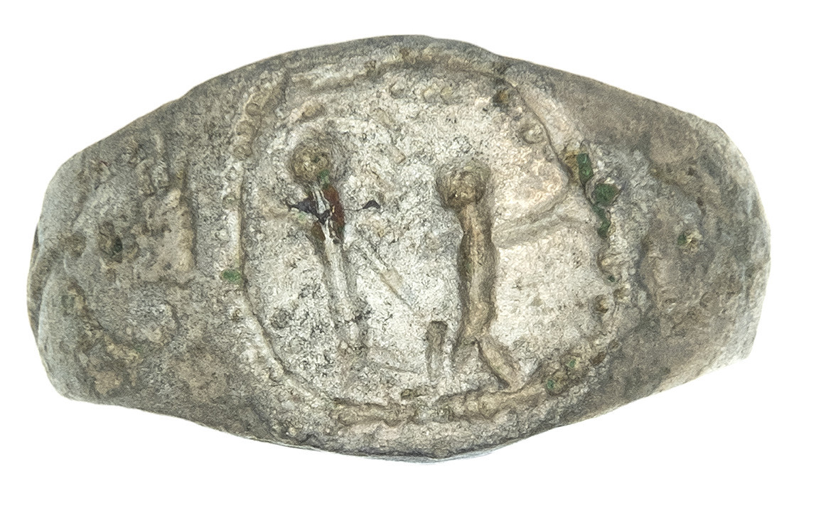 ARQUEOLOGÍA. EDAD MEDIA. Anillo de la región de los Balcanes, formado por un aro liso engrosado en su parte superior, en cuyo sello aparecen grabadas dos figuras humanas muy toscas. Este motivo se interpreta como un bautismo o quizás una bendición a uno de los miembros de un matrimonio (ss. XII-XIII). Plata. Longitud 20,4 mm. 4,76 gr.