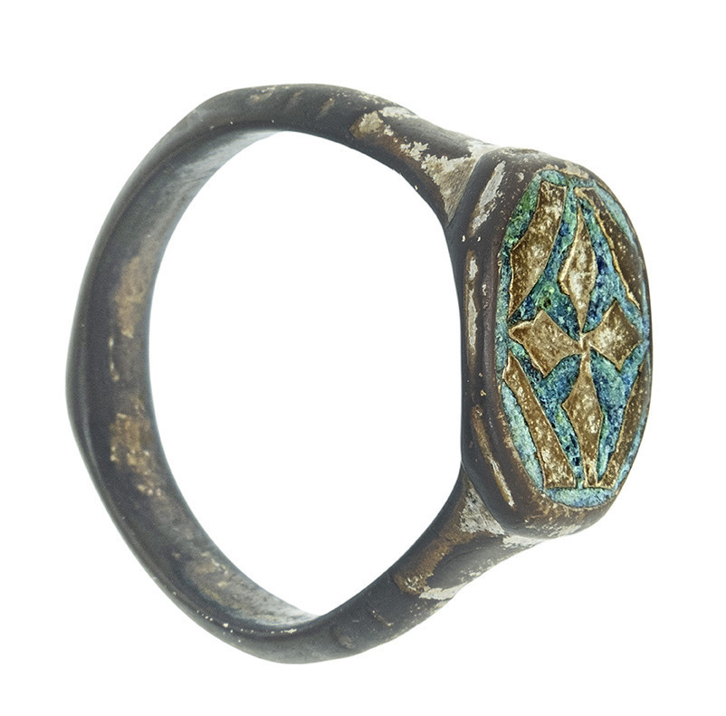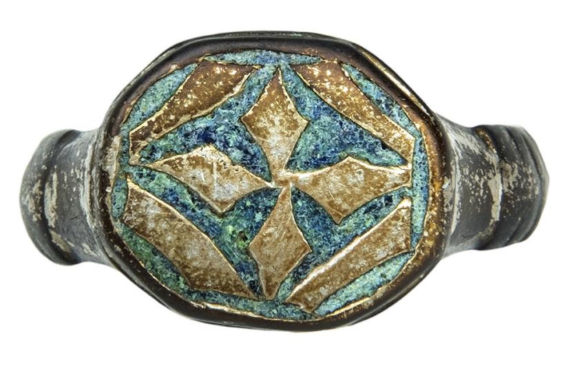 ARQUEOLOGÍA. EDAD MEDIA. Anillo tardo-medieval o moderno, posiblemente de los Balcanes, de aro apuntado y ligero engrosamiento en la parte distal, decoración incisa en la parte superior, y sello ovalado con un motivo cruciforme central, enmarcado por hojas esquemáticas y fondo de esmalte verde (¿siglo XIV o post.?). Plata. Longitud 22,5 mm. 9,48 gr.