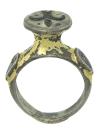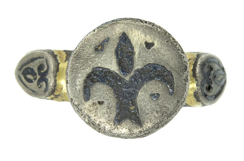 ARQUEOLOGÍA. EDAD MEDIA. Anillo tardo-medieval, posiblemente procedente de los Balcanes o de Europa del Este. El aro presenta dos aplique laterales en forma de escudetes con un motivo vegetal nielado en plata y plomo, misma técnica que presenta la flor de lis esquemática que se representa en el chatón, elevado en forma de cáliz (ca. siglo XV). Plata chapada en oro. Longitud 26,9 mm. 17,54 gr.