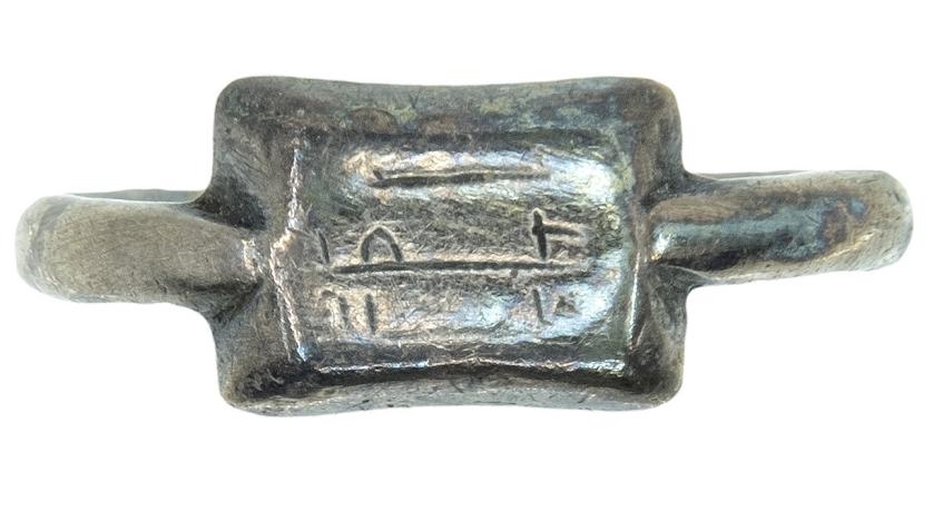 ARQUEOLOGÍA. AL-ÁNDALUS. Anillo signatario andalusí de aro liso que se une a un chatón de forma trapezoidal con una inscripción grabada en dos líneas ٣ ٨ ١ / ٢ ٨ ١ (siglo IX). Plata. Longitud 23 mm. 4,81 gr.