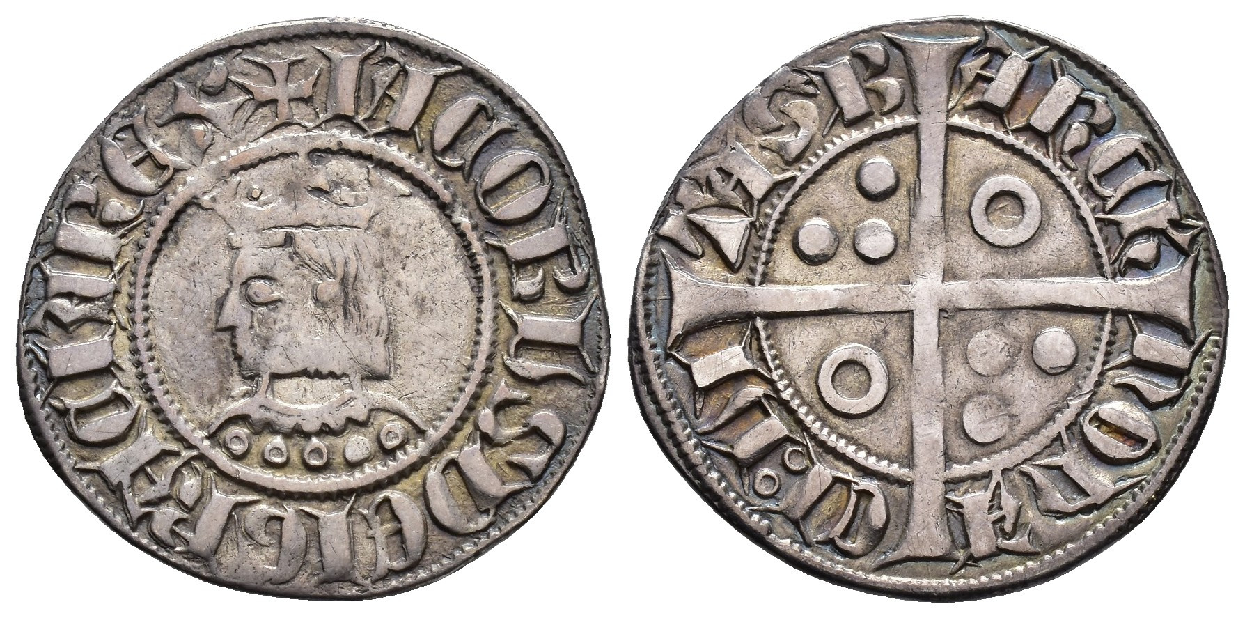 CORONA DE ARAGÓN. JAIME II EL JUSTO (1291-1327). Barcelona. Croat. Vestido con 5 anillos. 3 orbes en el primer cuartel. AR 3,11 g. 23,6 mm. IV-337 vte. Rayitas en anv. MBC-/MBC.