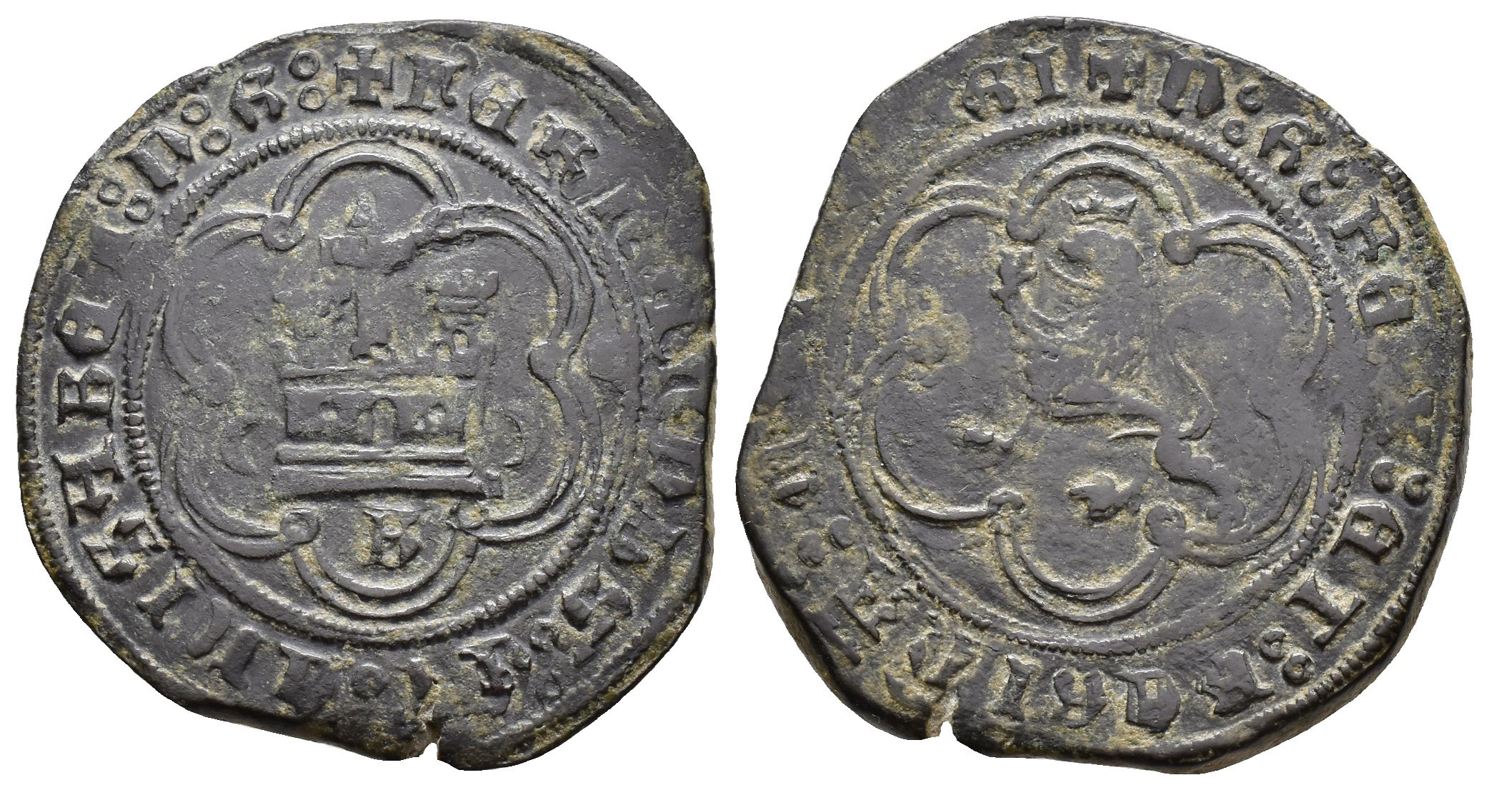 REYES CATÓLICOS (1474-1504). Burgos. 4 maravedís. Medias lunas acotando el castillo en vertical. Debajo B. CU 8,68 g. 28,6 mm. AC-120 vte. Cospel abierto. MBC-.