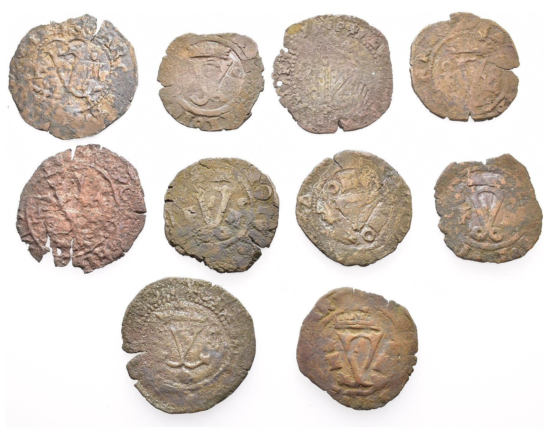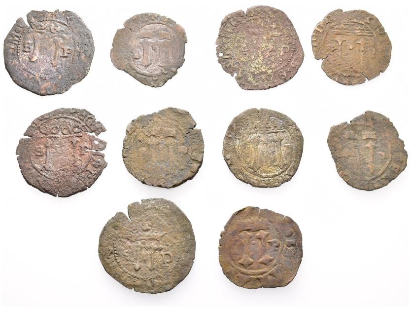 JUANA Y CARLOS. Lote de 10 piezas de 4 maravedís. Santo Domingo. AC tipo 13 y 14. De MC a BC-.