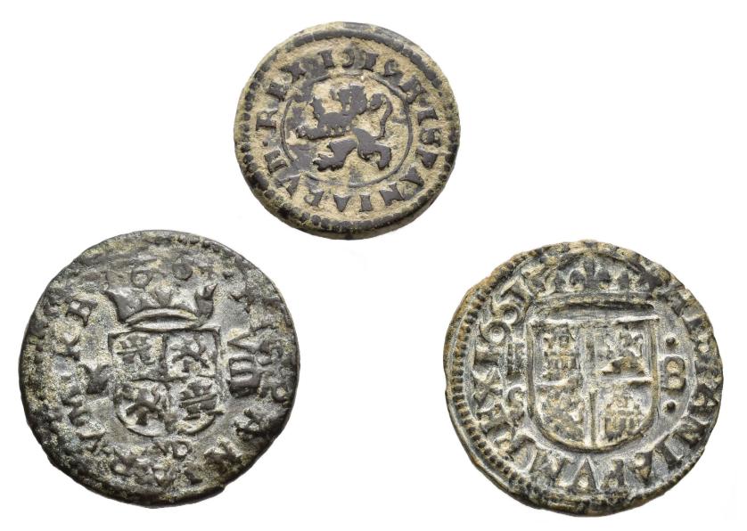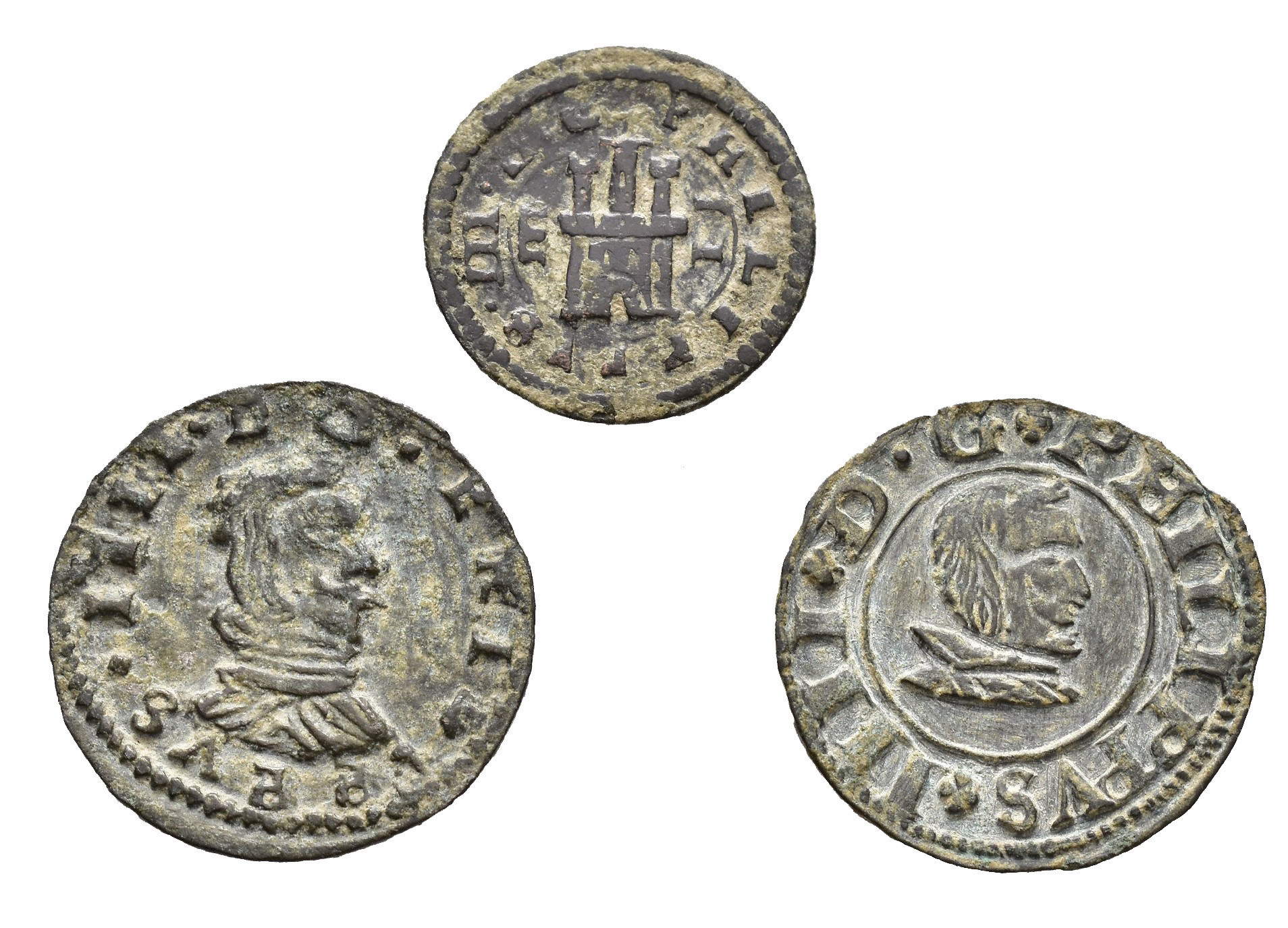FELIPE IV. Lote de 3 piezas: 2 maravedís Segovia 1619; 8 mrs. Madrid 1661 y 8 mrs. Segovia 1661-S. De BC+ a MBC-.