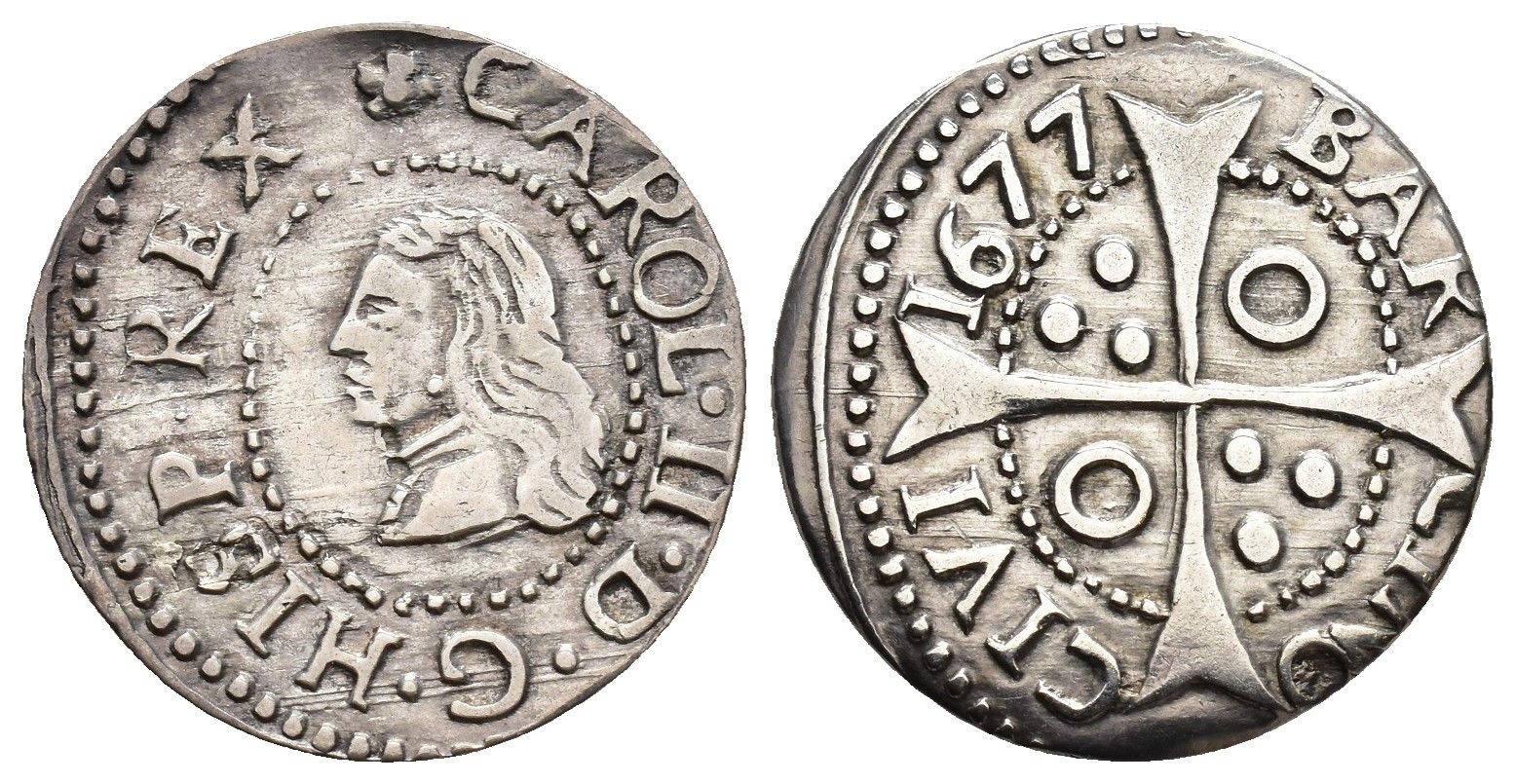 CARLOS II (1665-1701). Barcelona. Croat. 1677. AR 2,25 g. 21,2 mm. AC-208. Limpiada. Ligeramente descentrada. MBC.