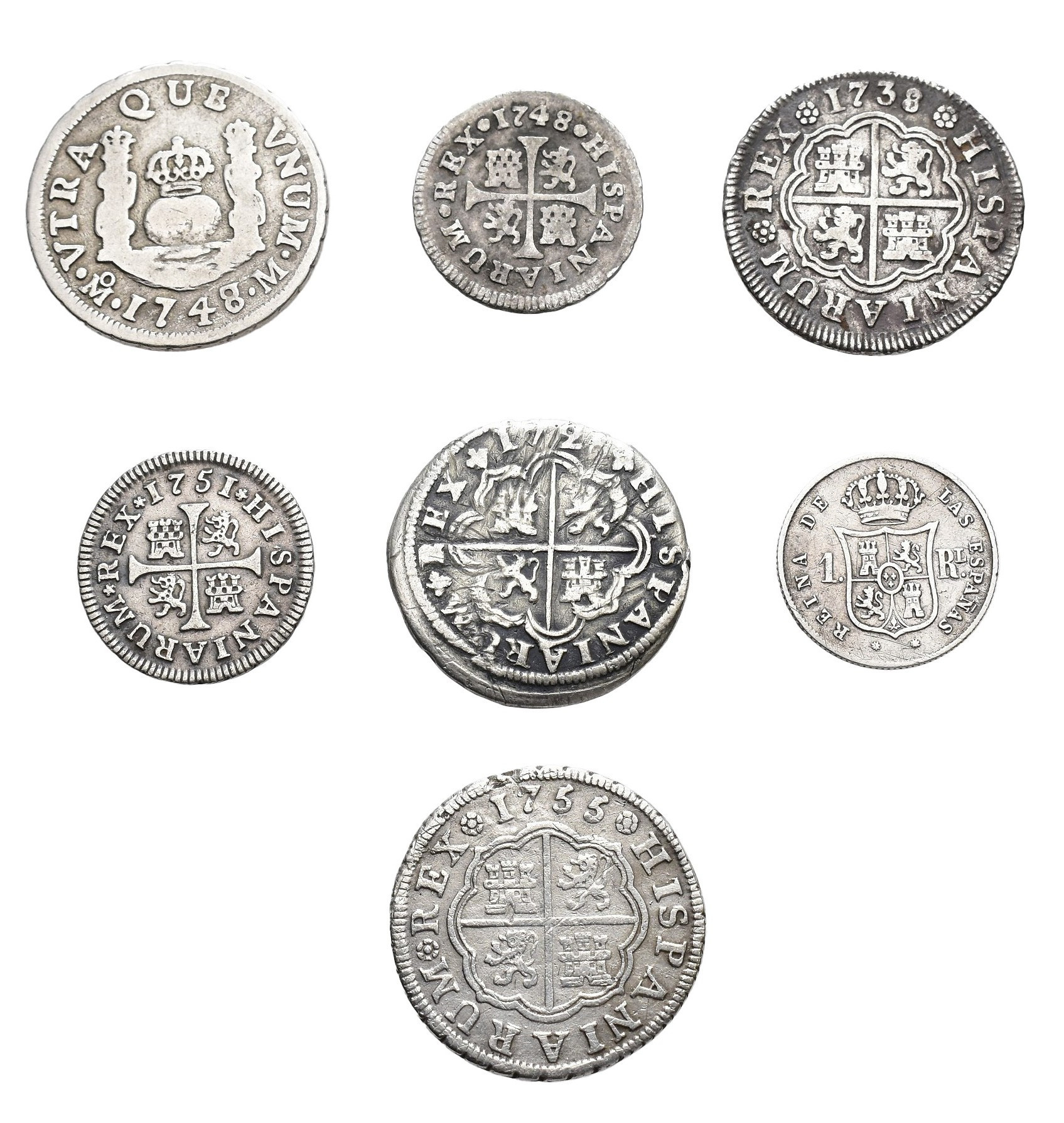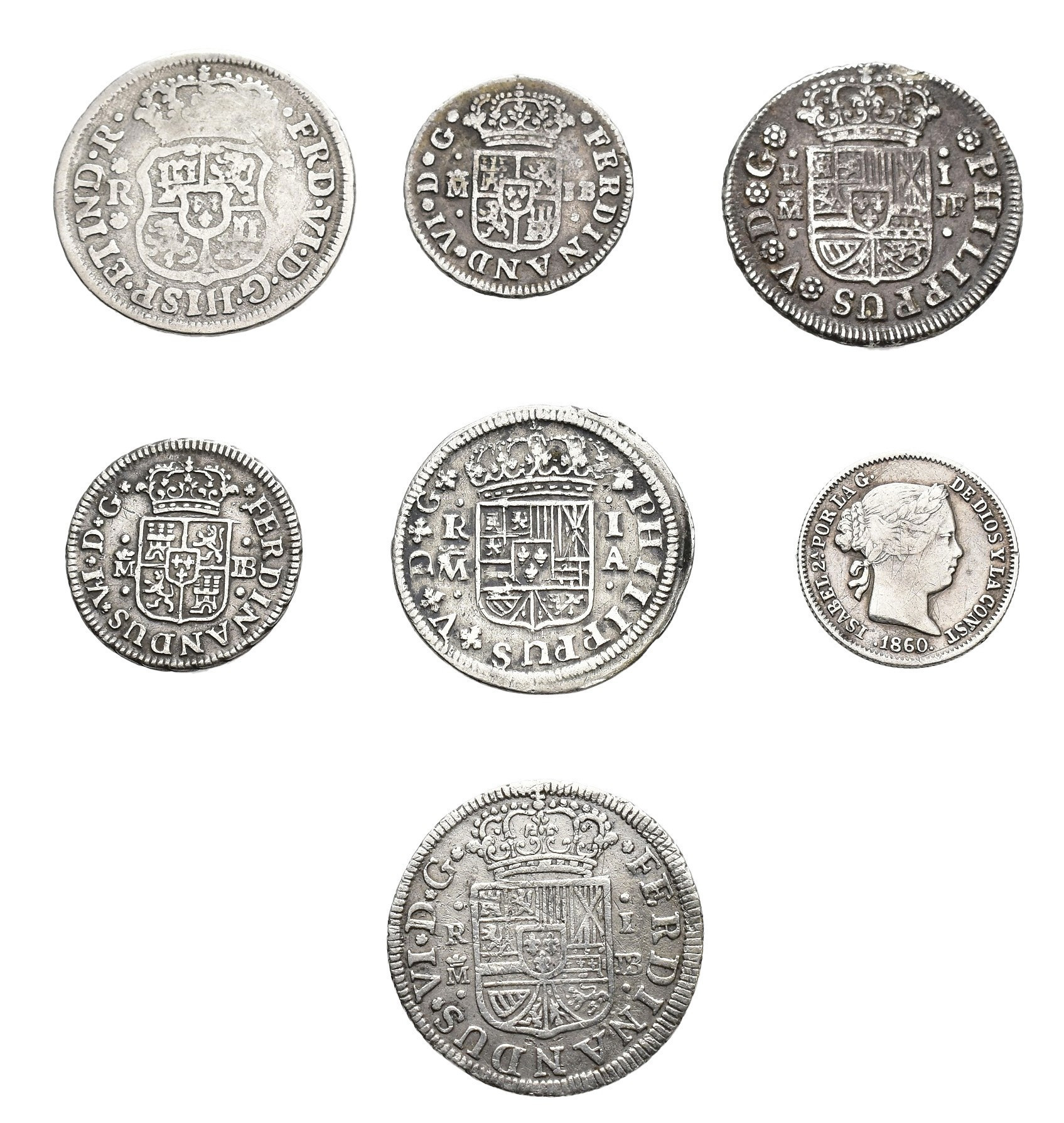 FELIPE V. Lote de 7 piezas: 2 de Felipe V -1 real de Madrid de 1728 y otro de 1738-; 4 de Fernando VI -1/2 real de Madrid 1748 y otro de 1751, 1 real Madrid 1755 y otro de México 1748-; 1 real de Isabel II, Barcelona 1860. MBC-/MBC.
