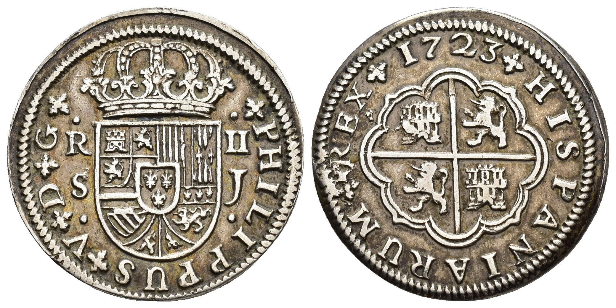FELIPE V (1700-1746). Sevilla. 8 reales. 1723. J. AR 5,71 g. 28 mm. VI-784; AC-981. Rebaba en rev. MBC.