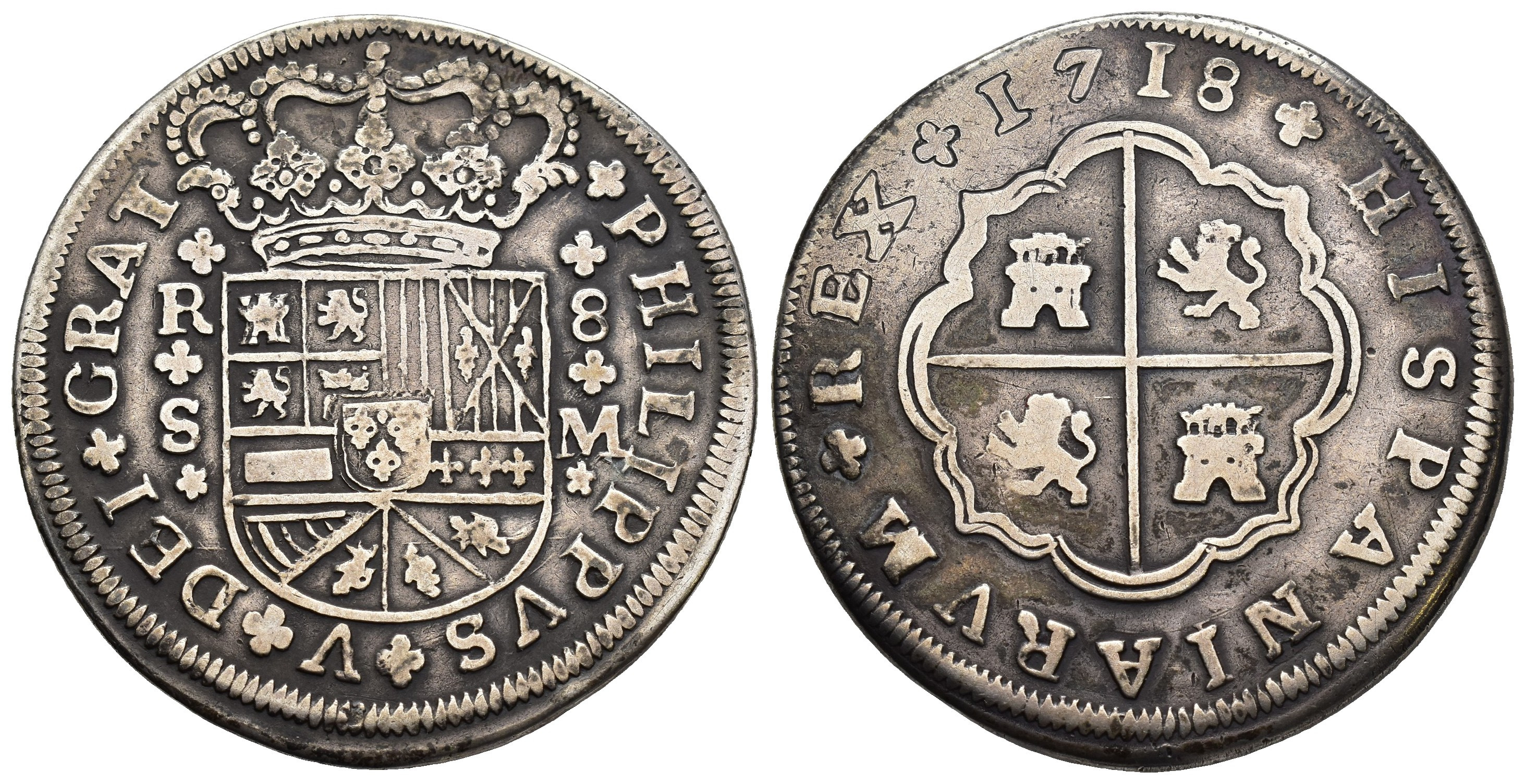FELIPE V (1700-1746). Sevilla. 8 reales. 1718. M. AR 21,62 g. 40,6 mm. VI-1258; AC-1617. Ley. de rev. parcialmente burilada. MBC-.
